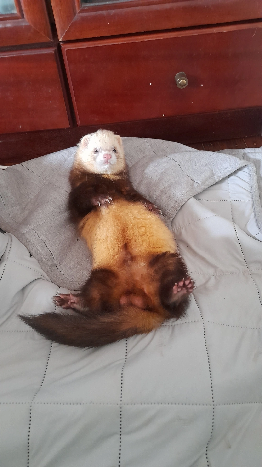 Is a very cute ferret, very friendly and lovely. Ferrets doesn't know their way back home, so I'm very worried, and they don't eat any food, only special food like kangaroo meat.