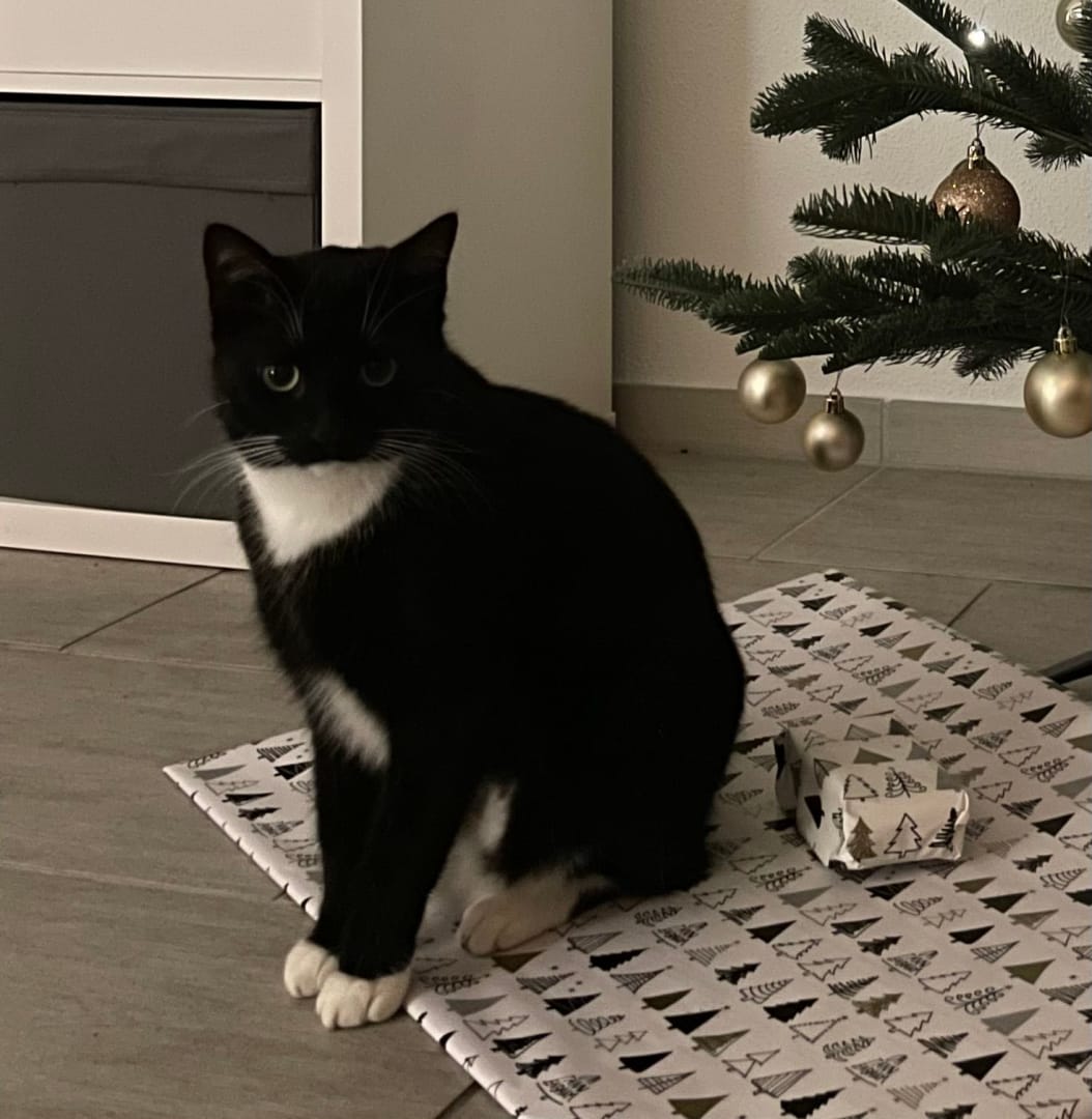 Er hat weiße Pfötchen sowie weißes Fell unterm Bauch. Außerdem hat er eine weiße „Schürze“ unter Gesicht.