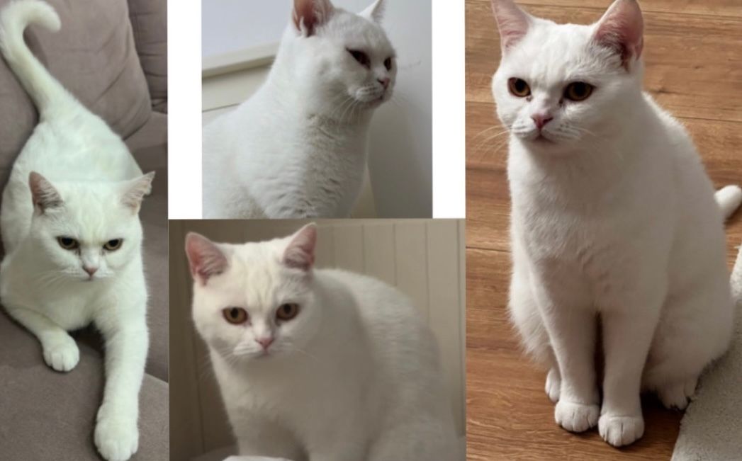 Unsere Katze ist komplett weiß und hat einen kleinen schwarzen Fleck am linken Ohr