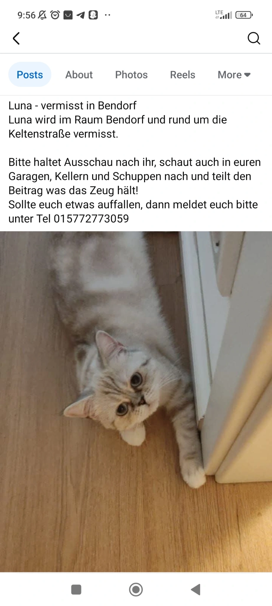 Hast du Luna gesehen? Bitte hilf uns und schau auf Dachböden, in Garagen, Schuppen und Außenbereichen nach.