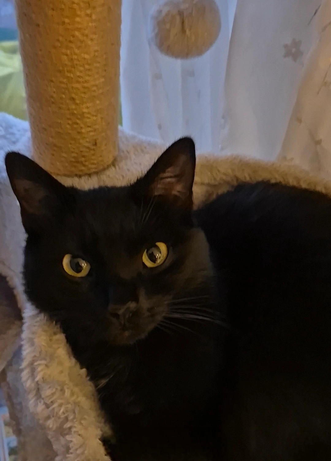 Er ist ganz schwarz mit einer kleinen Blässe an der Brust. Sein Fell war bei und seidig glänzend. Da er nun schon über 3 Wochen unterwegs ist, wird es vielleicht nicht mehr ganz so glänzen.