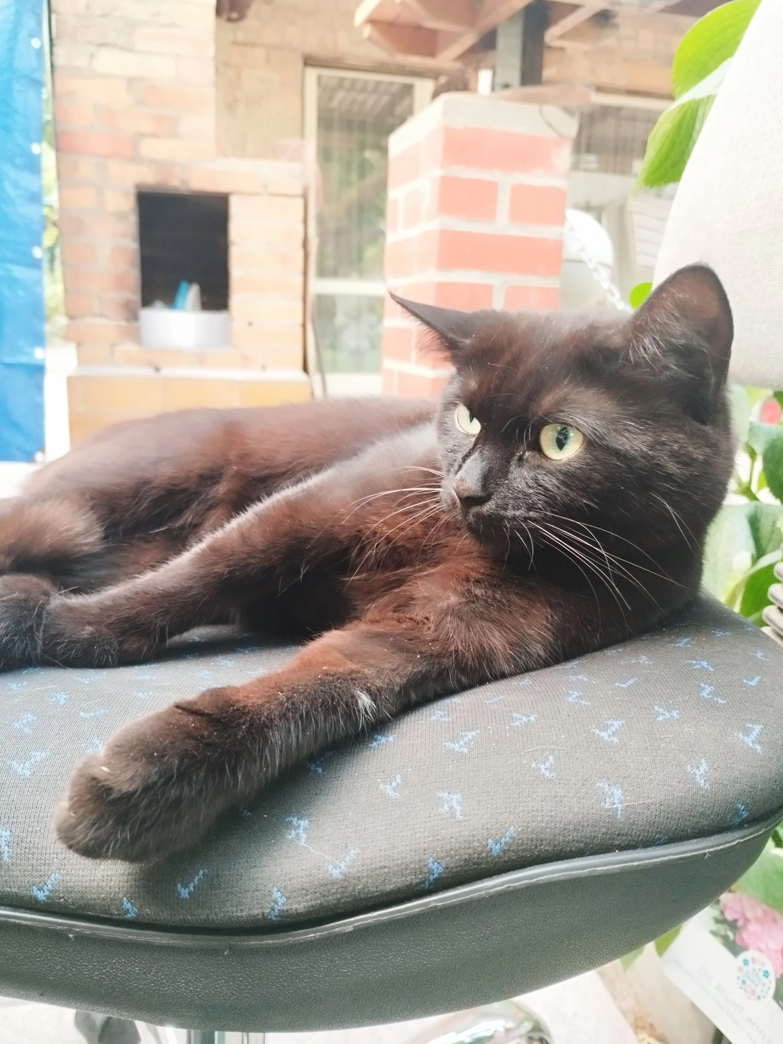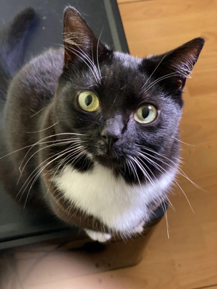 Tacos ist eine zierliche Katze (schwarz mit weißem Lätzchen und weißen Pfötchen). Seine rechte Hinterpfote hat einen schwarzen Fleck