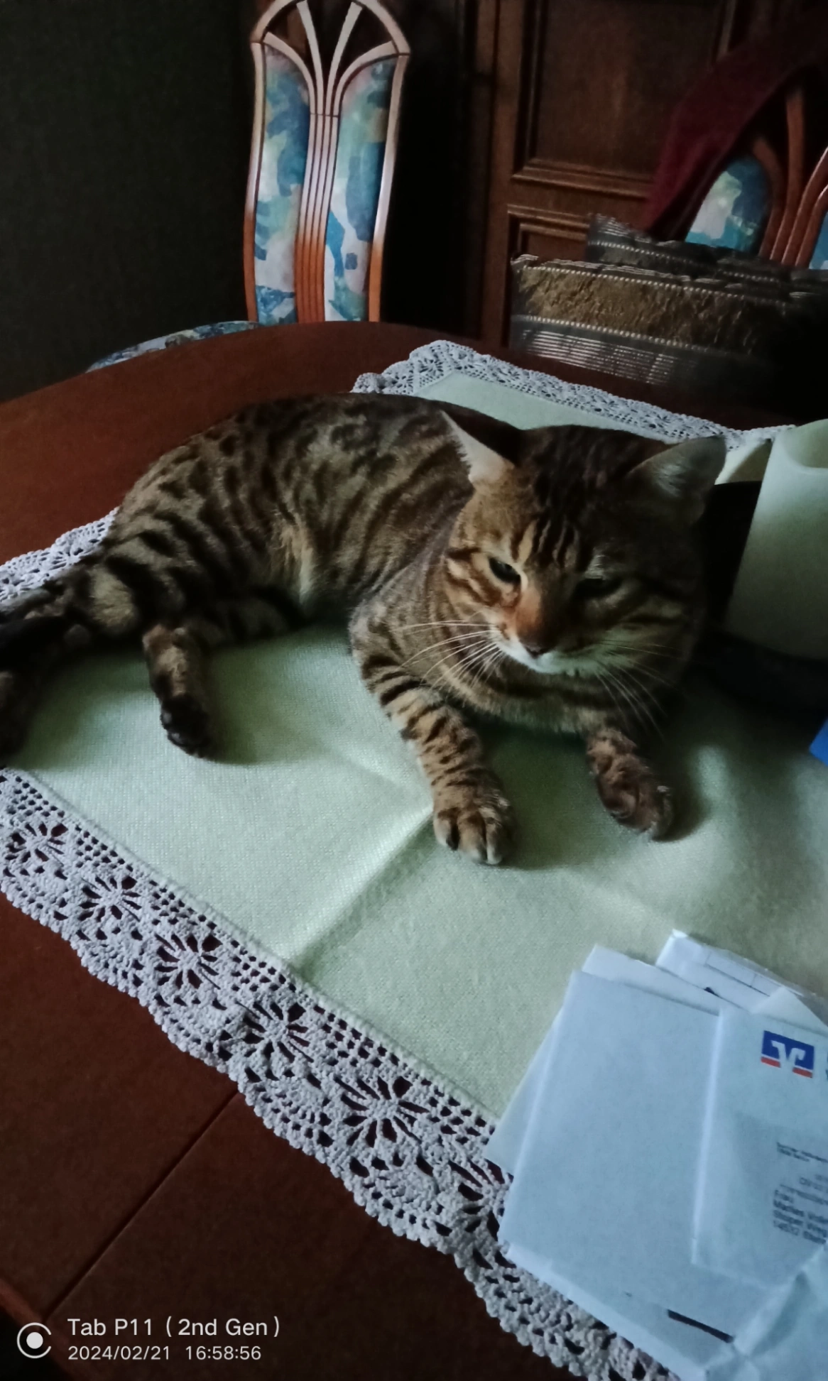 Der Kater hat ein schwarz braun getigertes Fell, weißes Fell um die Schnauze, relativ große Ohren und eine weiße Spitze am Schwanz. Er ist gechipt und mauzt viel und laut.