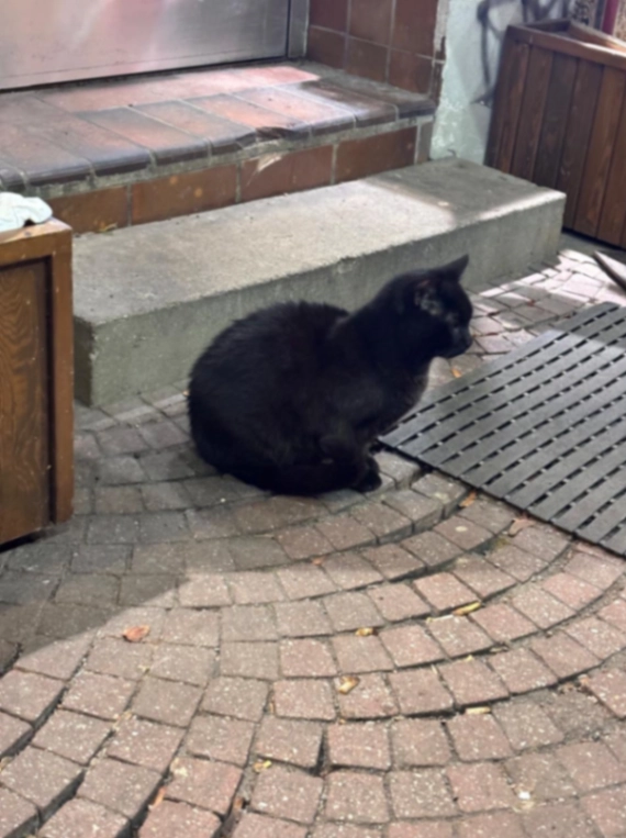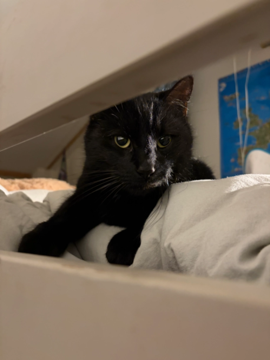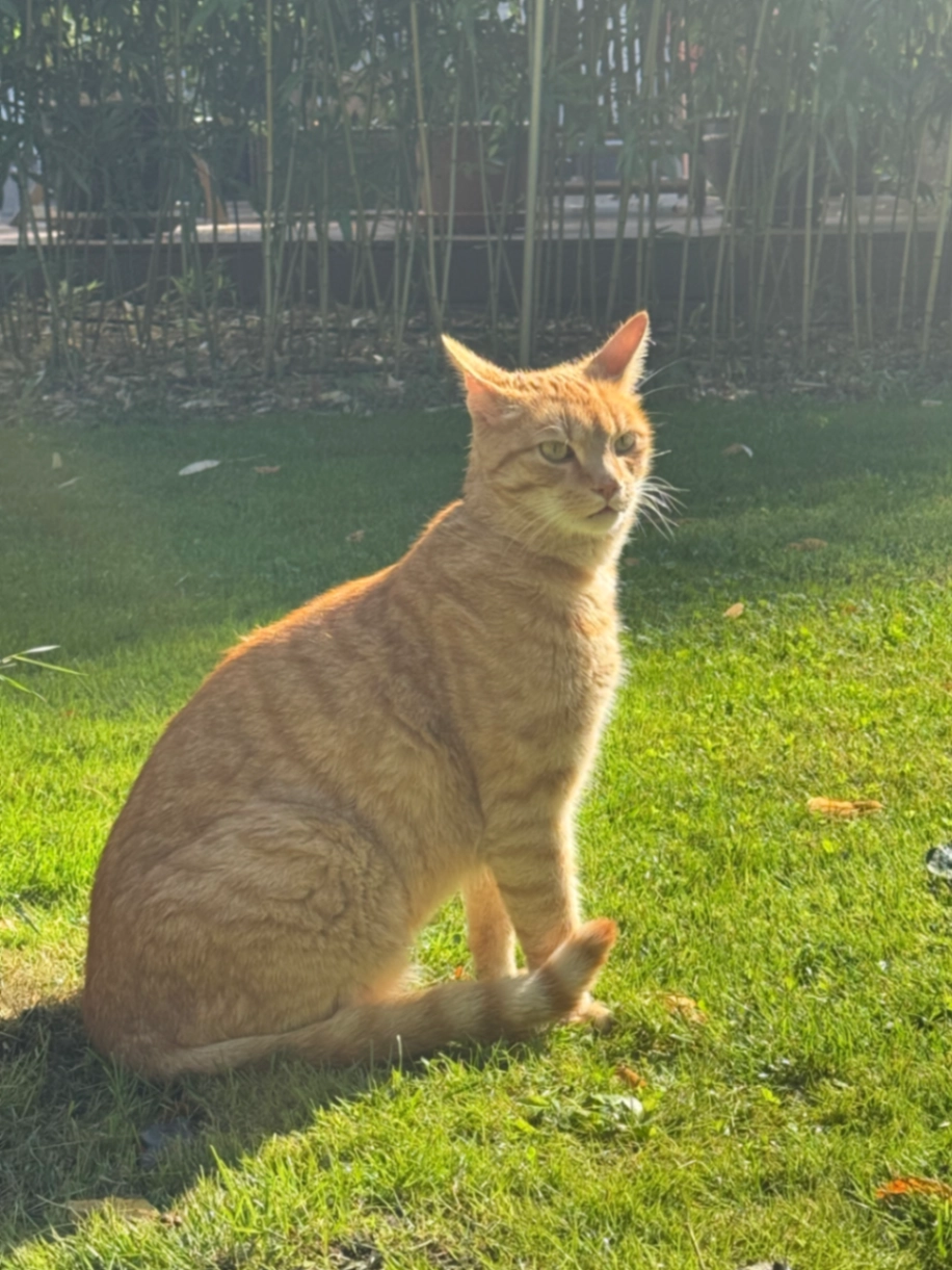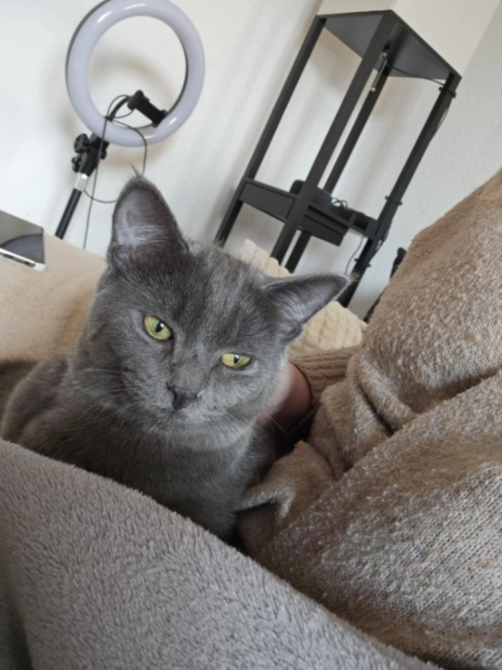 Weißer Fleck am Bauch. Zutraulich. Klettert gern in Autos.