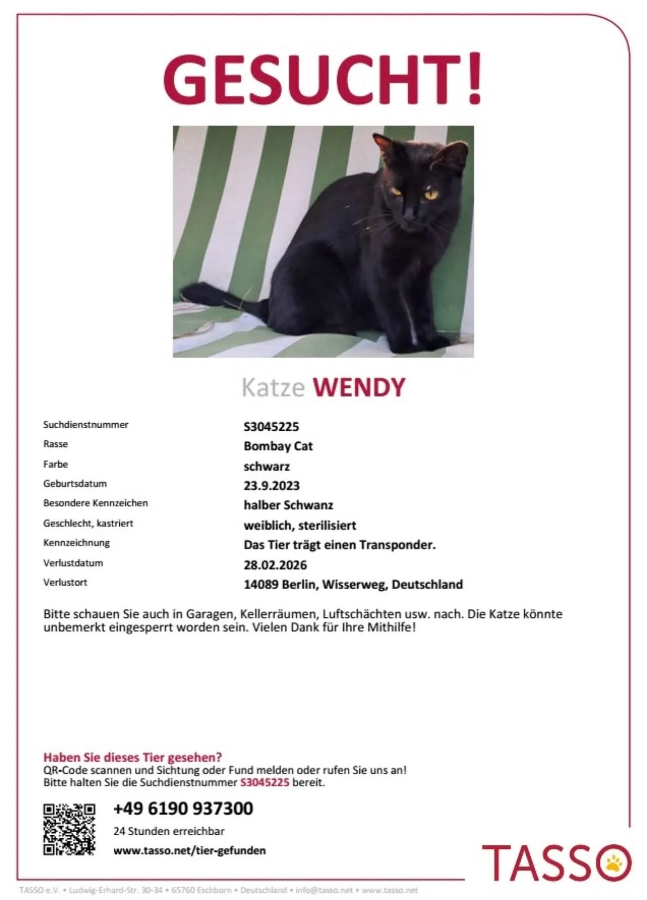 Hast du Wendy gesehen? Bitte hilf uns und schau auf Dachböden, in Garagen, Schuppen und Außenbereichen nach.