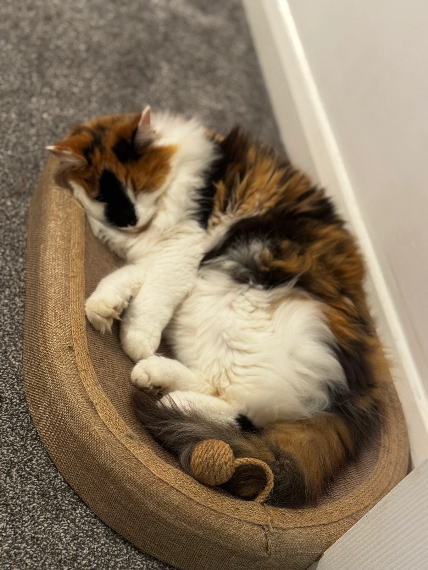 Pelly is medium haired with a very fluffy tail, he has a totally white face, legs and tummy with black spots on the back of his head and on his back and sides. His tail is black. He has light yellow eyes and a pink nose. He is neutered and microchipped.