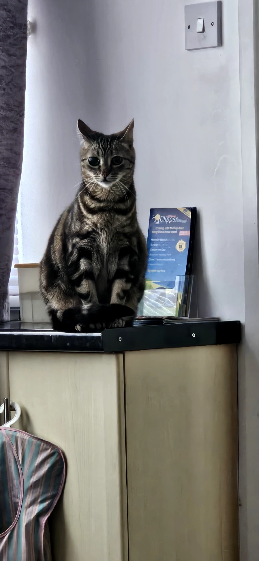 Loving and timid girl who loves warmth and snuggles. Neutered and microchipped. Typical marble tabby markings with spots on her tummy.