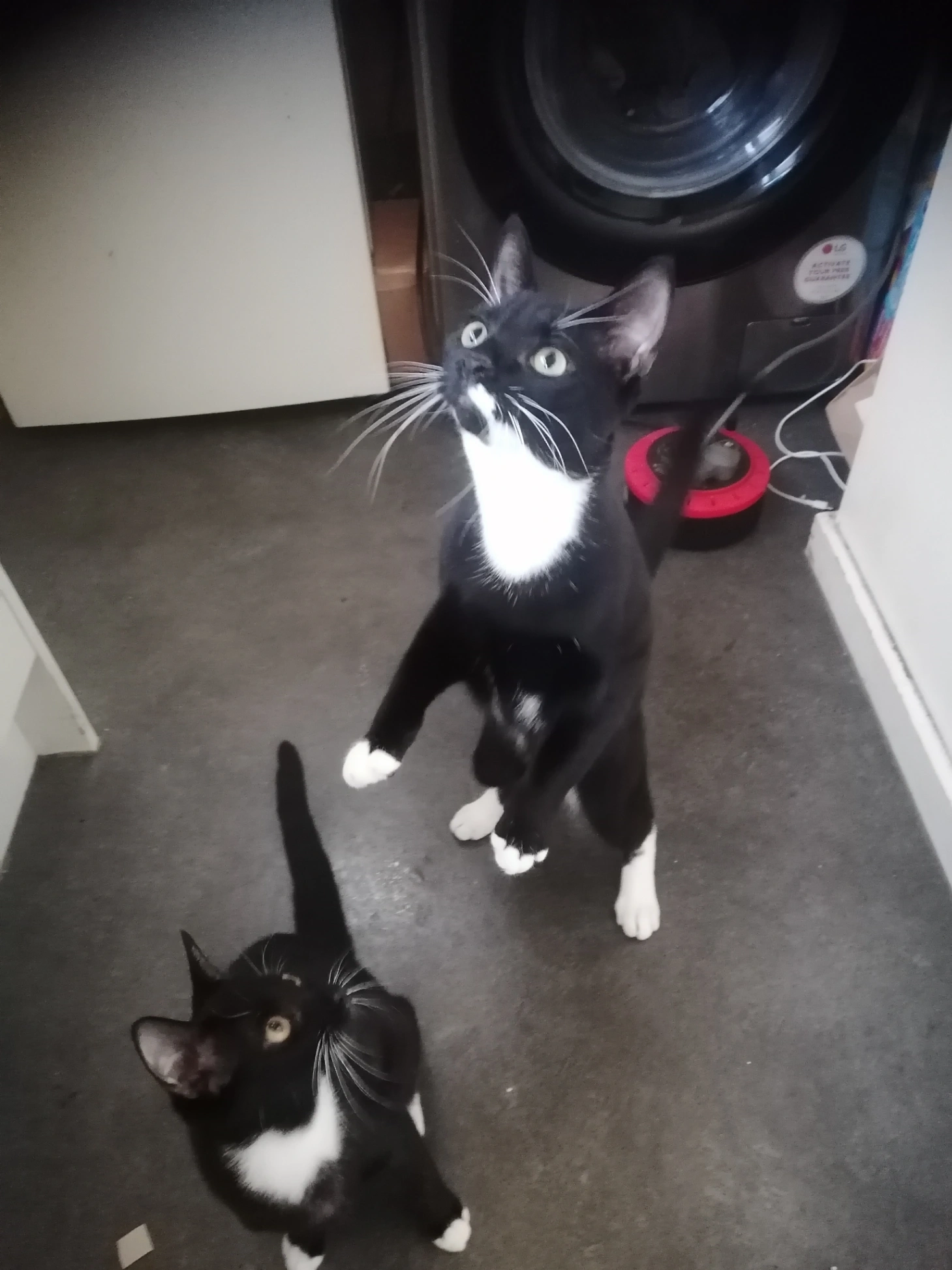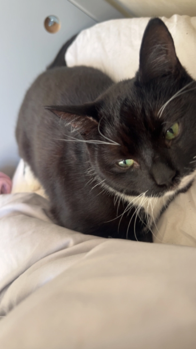 Black and white tuxedo cat with a moustache , 3-4 year old , mark on bridge of nose ,green eyes