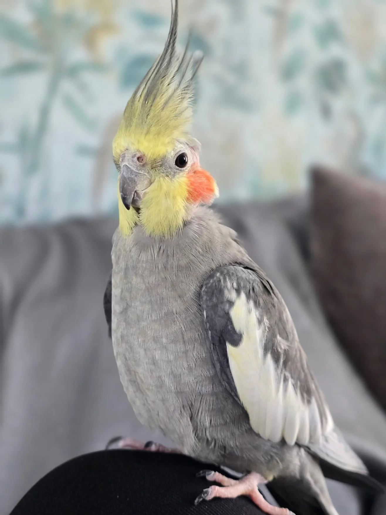 George is a hand reared male cockatiel. He is tame, and friendly. He loves cornflakes, and millet. He steps up onto a finger. He says peekaboo. Wolf whistles. He is one of a bonded pair born and hand raised together. He has a bald patch on the back of his head, where his mate over grooms him.