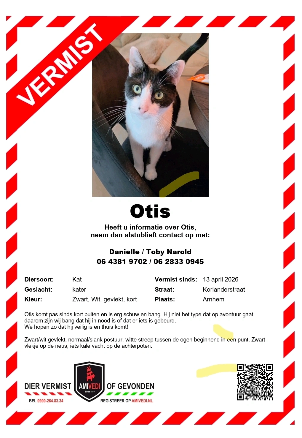 Otis komt pas sinds kort buiten en is erg schuw en bang. Hij niet het type dat op avontuur gaat daarom zijn wij bang dat hij in nood is of dat er iets is gebeurd.