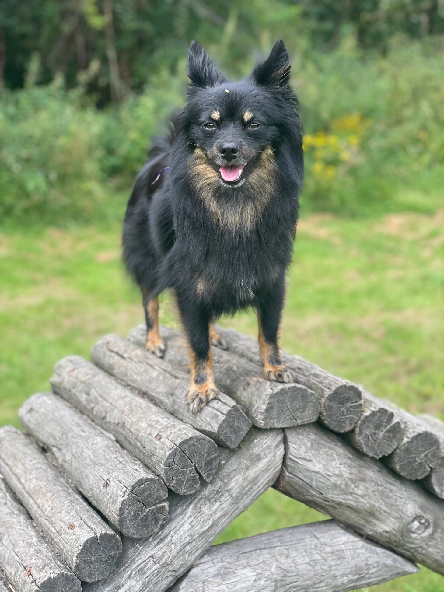 Levendig, klein, langharig, zwart met wat bruin, pluimstaart