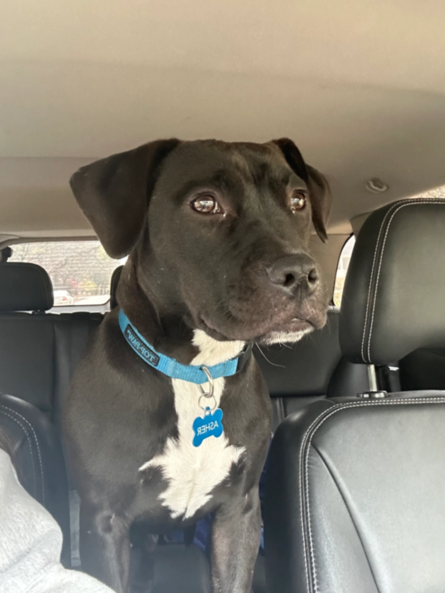 Asher is a medium size black dog with a white chest. He’s shy but very sweet.