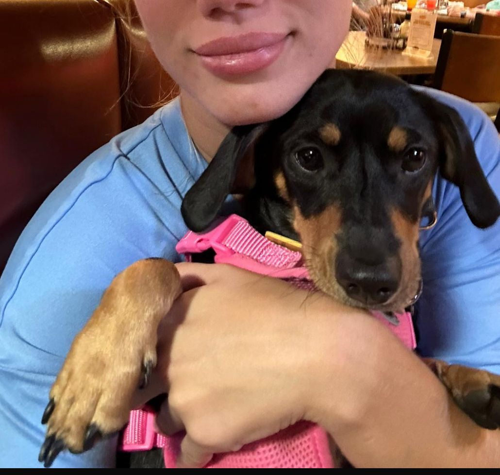 Dachshund. 1 year old. Female. Tan (black with brown color, white belly). She has 5 fingers on her back leg. PLEASE. SHE IS MY BABY