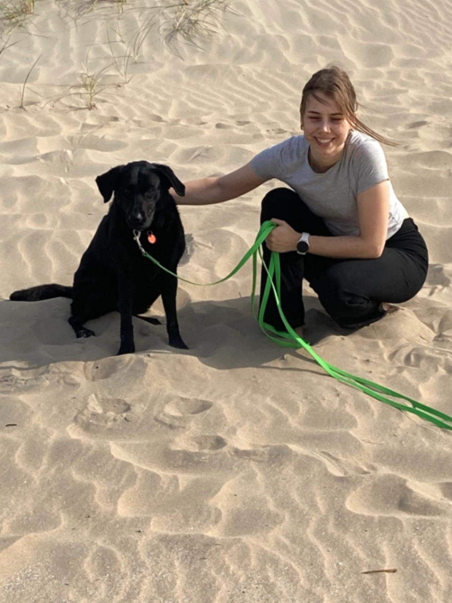 Zwarte Labradorkruising (ziet uit als Lanrador) aan lange fel groene sleeplijn . Ze draagt een tuigje