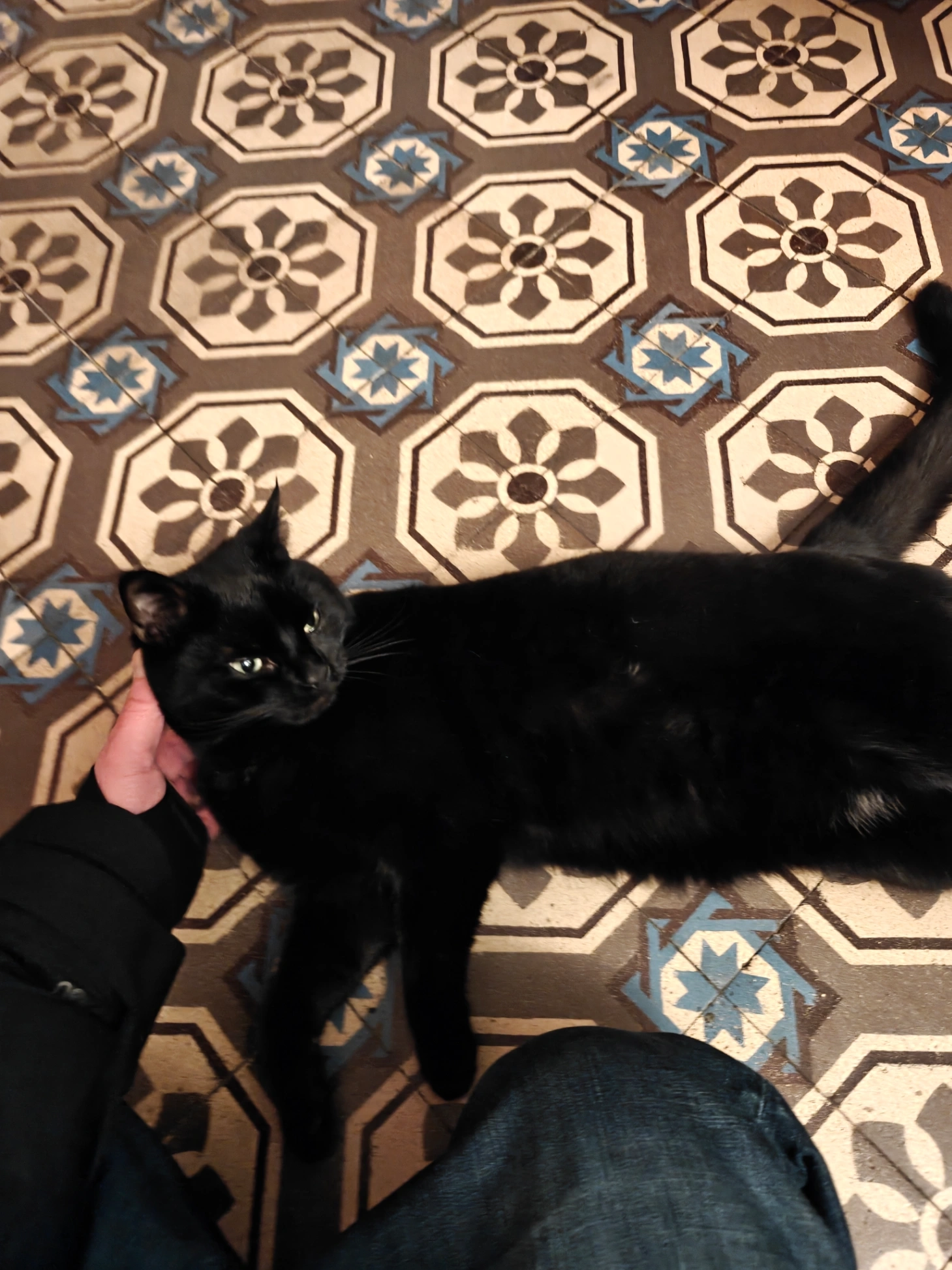 Schwarze Kate mit Orange Halsband. Kräftige Statur sieht aus wie en kleiner puma.