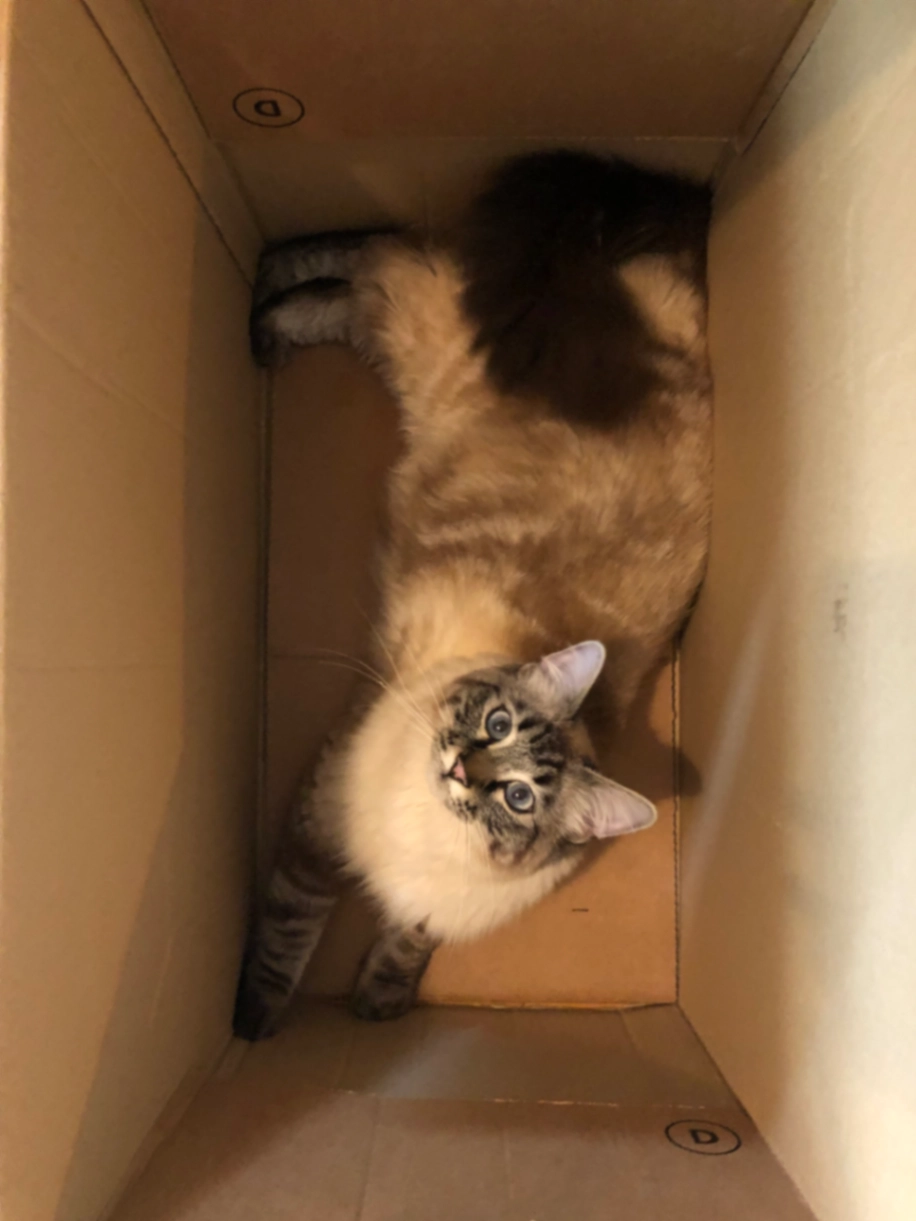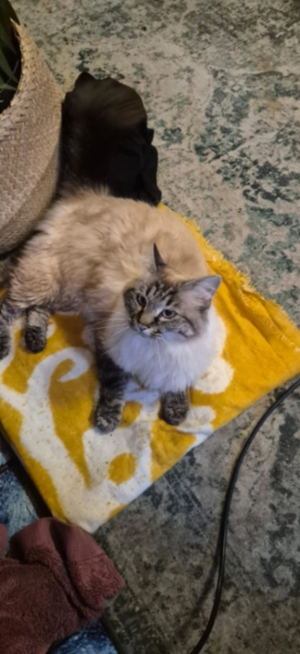 Esco ist halb Main Choon, mit blauen Augen, eher gross (5kg) und mit langen ganz weichen Haaren. Er ist sehr offen und geht auf Menschen, besonders Kinder zu und kriecht auch gerne in Boxen, Kisten, Kübel etc. sieht sich auch gerne andere Wohnungen an - weil er ausgeprägt neugirig ist.