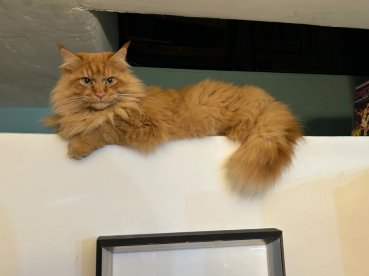 Ein sehr zutraulicher Kater, mit einer Krümmung am Schwanz (von Geburt an), er ist eine Maincoon Katze und sehr verschmust