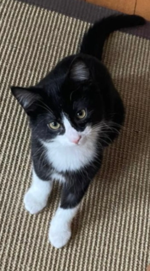 Schwarz-weiß mit komplett weißen Pfoten, ca 4kg, sehr neugierig