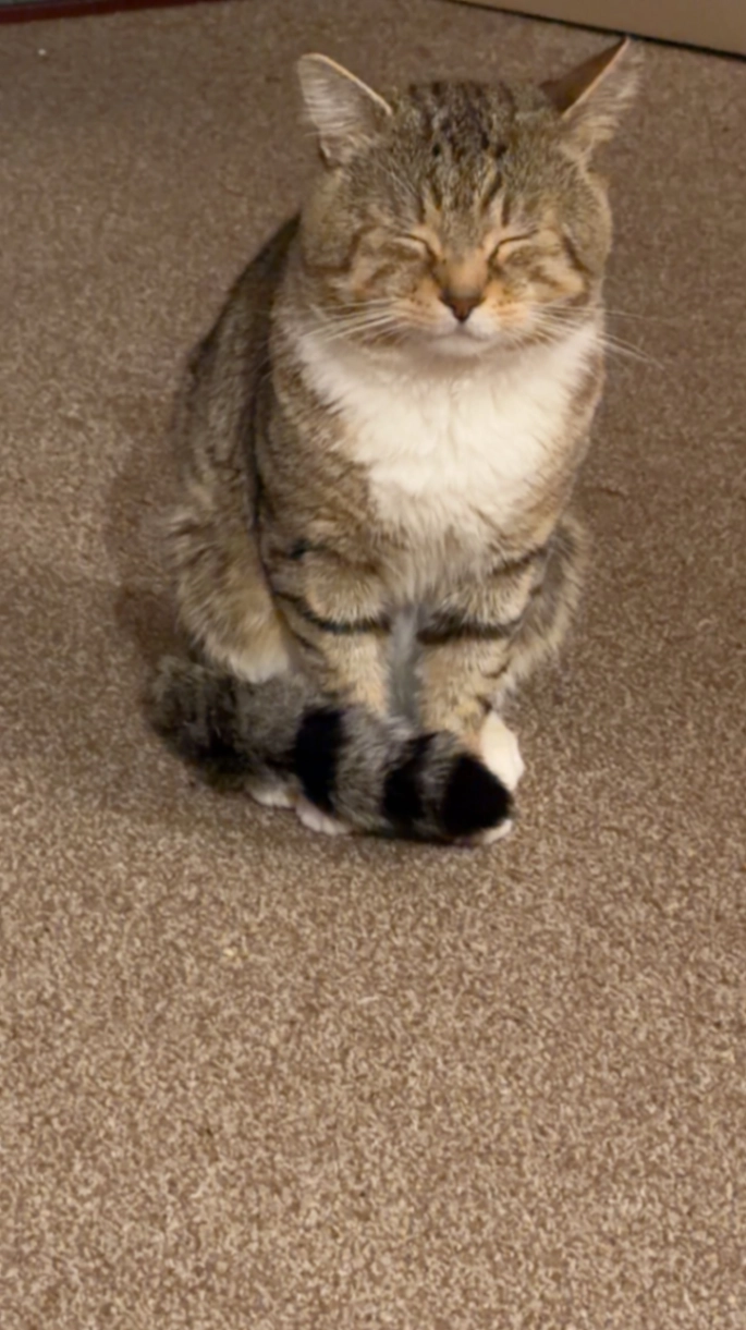 Recently had surgery, back end fur growing back . Blue AirTag around neck