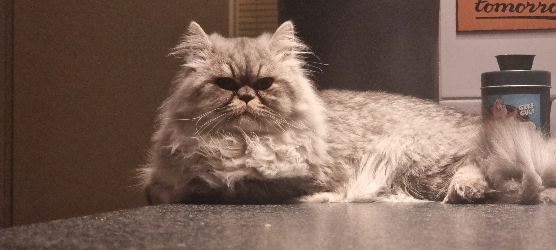 Kater van 2,5 jaar. Heeft een zwarte vacht met een licht grijze ondervacht. Knal gele ogen, maar als hij bang is zal je daar weinig van zien ivm grote pupillen. Is vaak in bosjes te vinden en vind gras heerlijk liggen. Hij reageert goed op zijn naam en het geluid van een sleutelbos vind hij ook interessant.