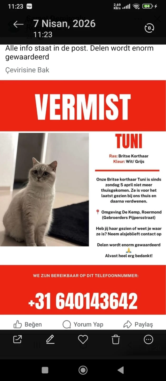 Heb je Koeki misschien gezien? We zijn erg bezorgd. Zou je alsjeblieft in je garage, schuur, zolder, tuin en op je terras willen kijken?
