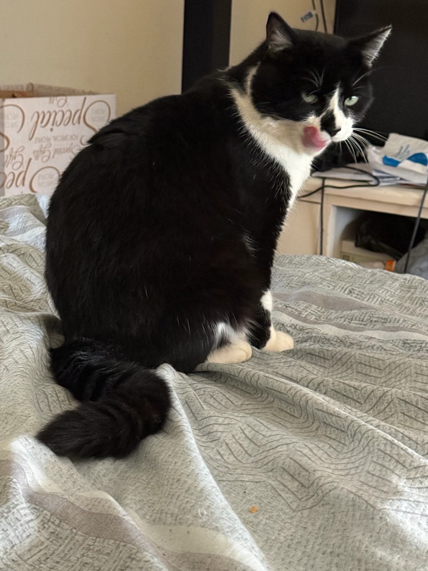 Boots is een grote zwart-witte kat zonder halsband, erg vriendelijk. Hij komt misschien wel naar je toe als je hem roept. Hij is vermist geraakt op 2 maart 2026 in de ochtend. Hij sprong van ons balkon en rende weg.