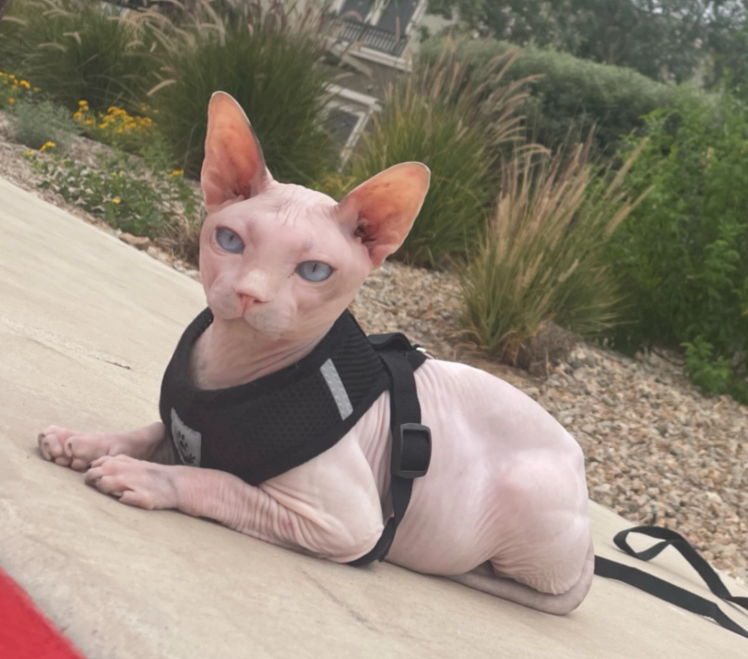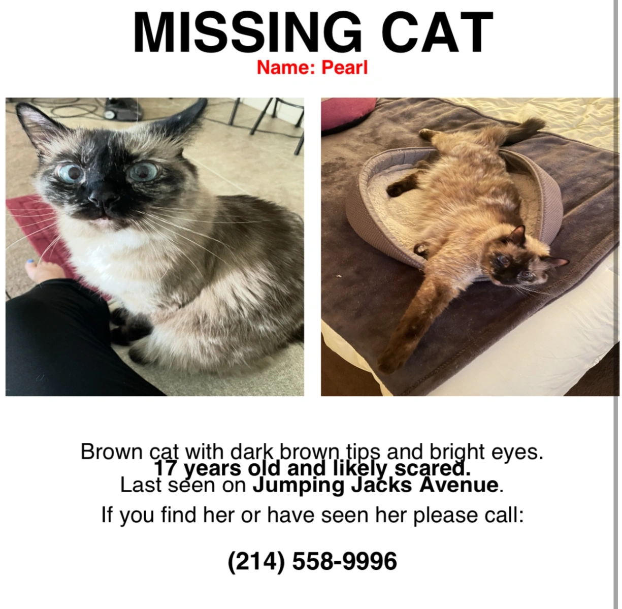 Light brown Body, and dark brown head, with blue eyes. Part RagDoll breed. 17 years old. Shy and scared. Lost in area she just moved to.