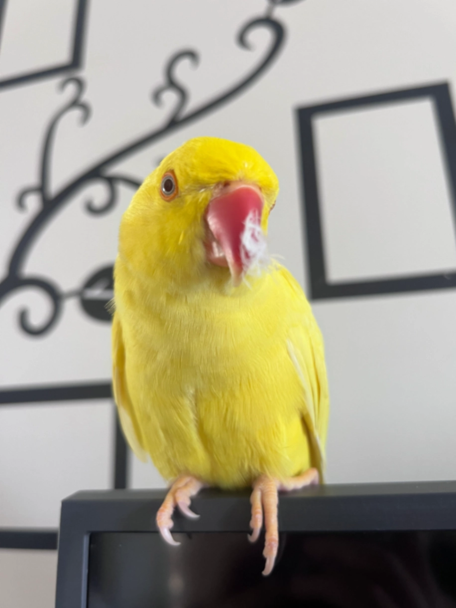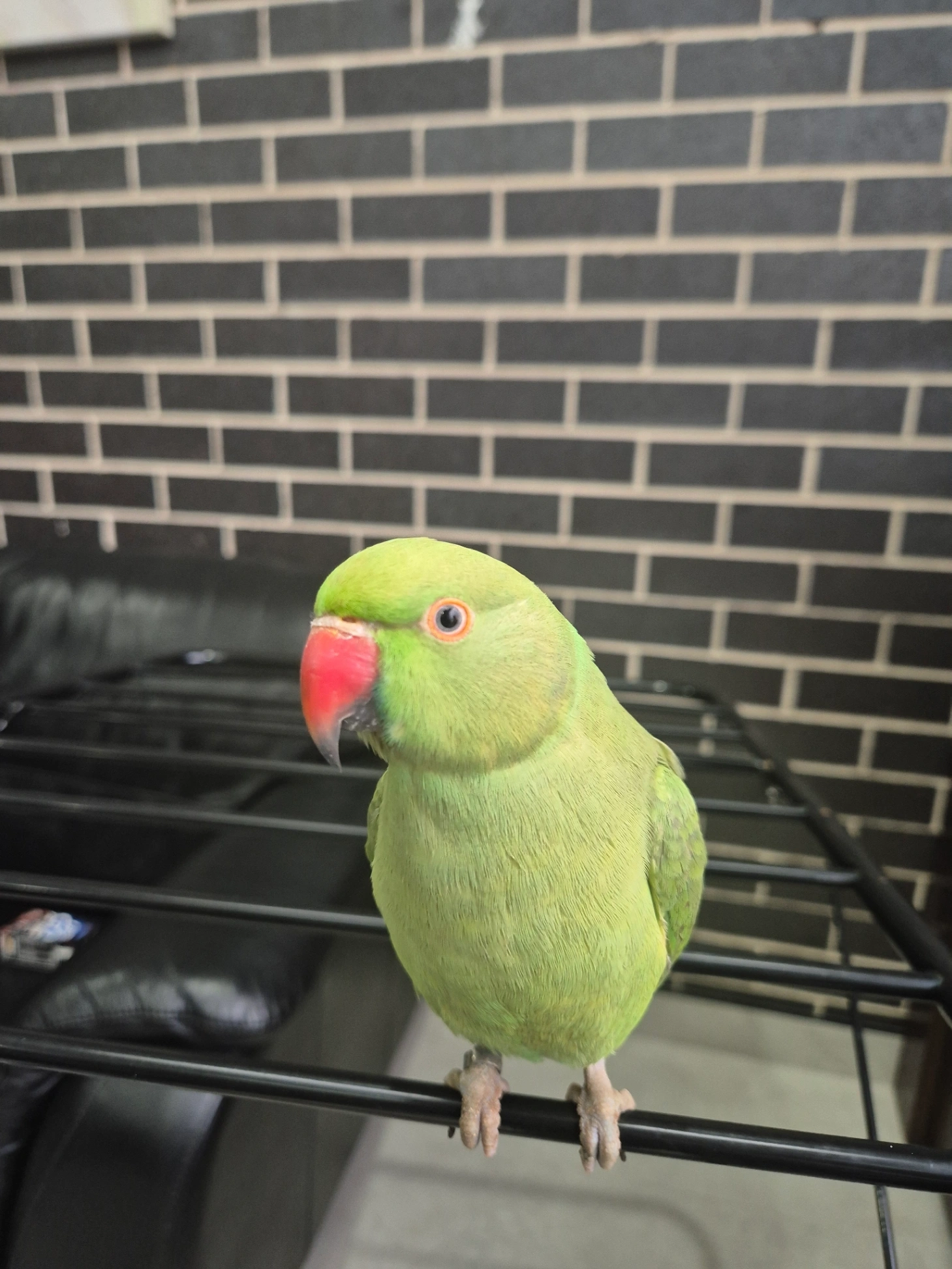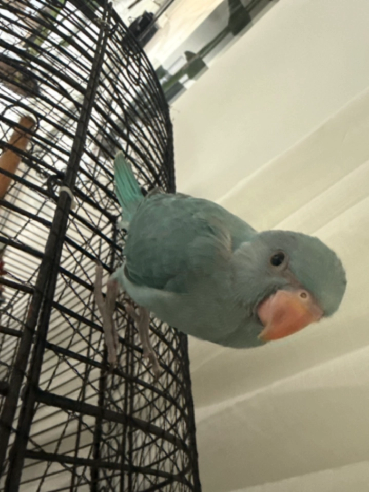 Aqua coloured parrot, his wings are clipped and he can’t fly too far, he’s very friendly and does not bite.