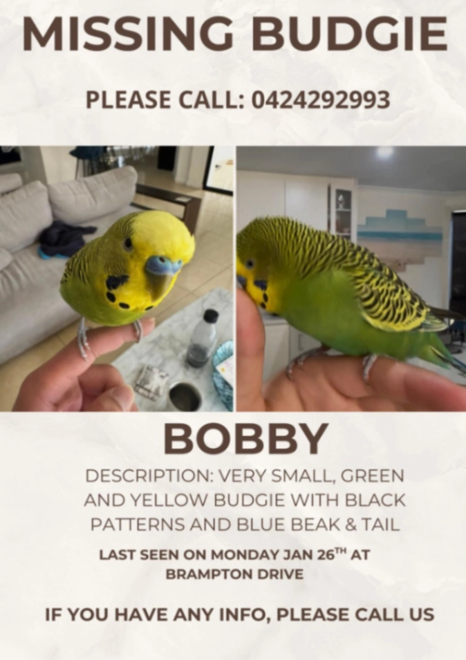 Green and yellow small budgie with blue tail and beak. Very friendly and has black patterns on green body