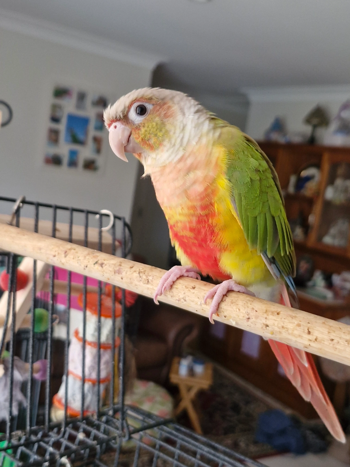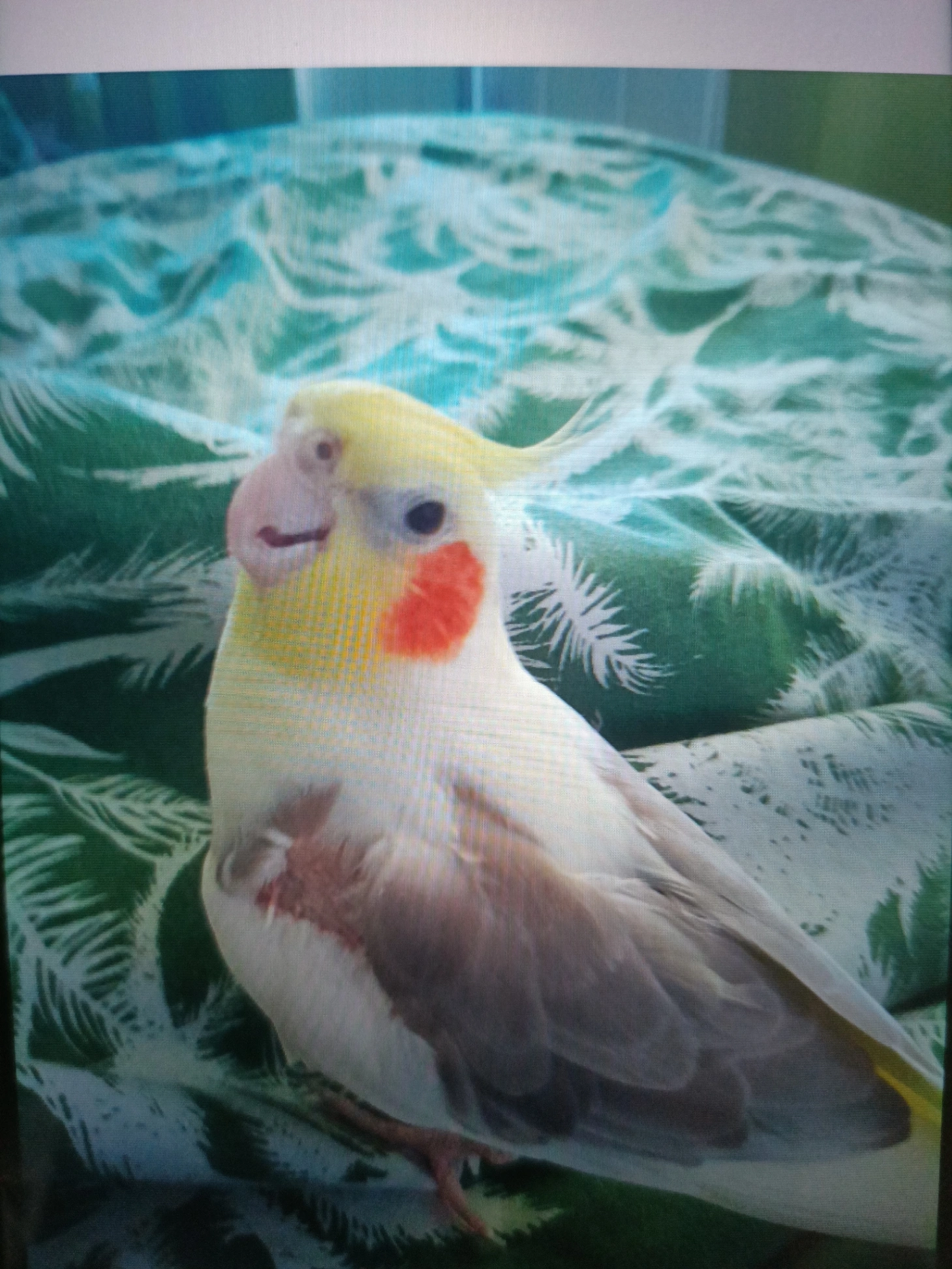 His name is Birdy, he is 9 years old. Very very friendly, talks whistles. Will land on your shoulder.