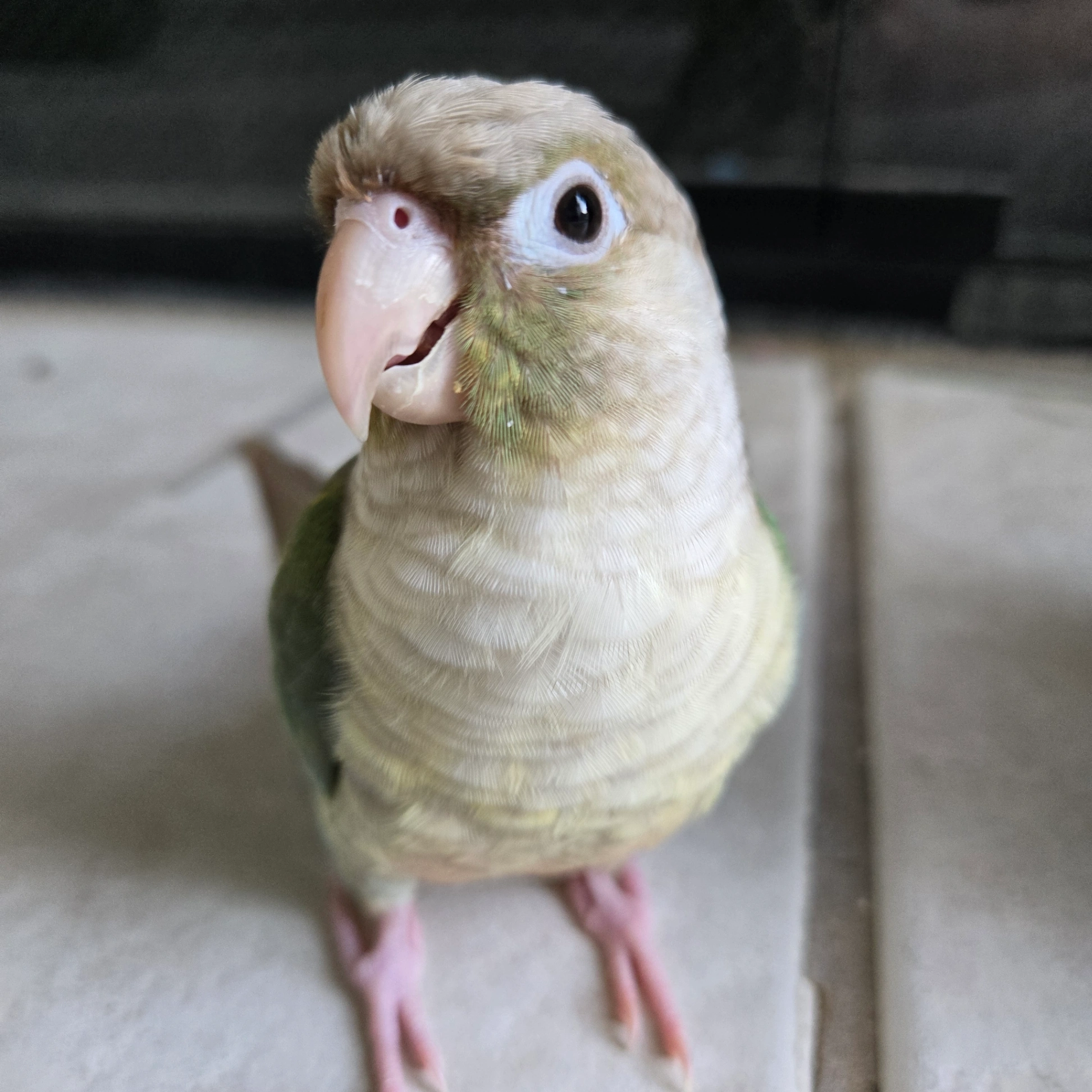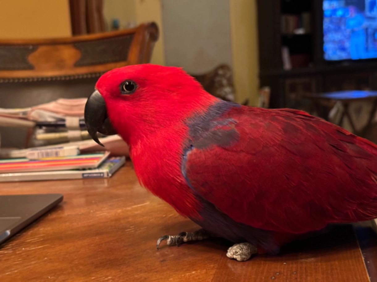 Red and blue, female eclectus parrot with missing toes on her left foot from a previous accident. She should be able to fly somewhat but she mostly will walk on the ground.
