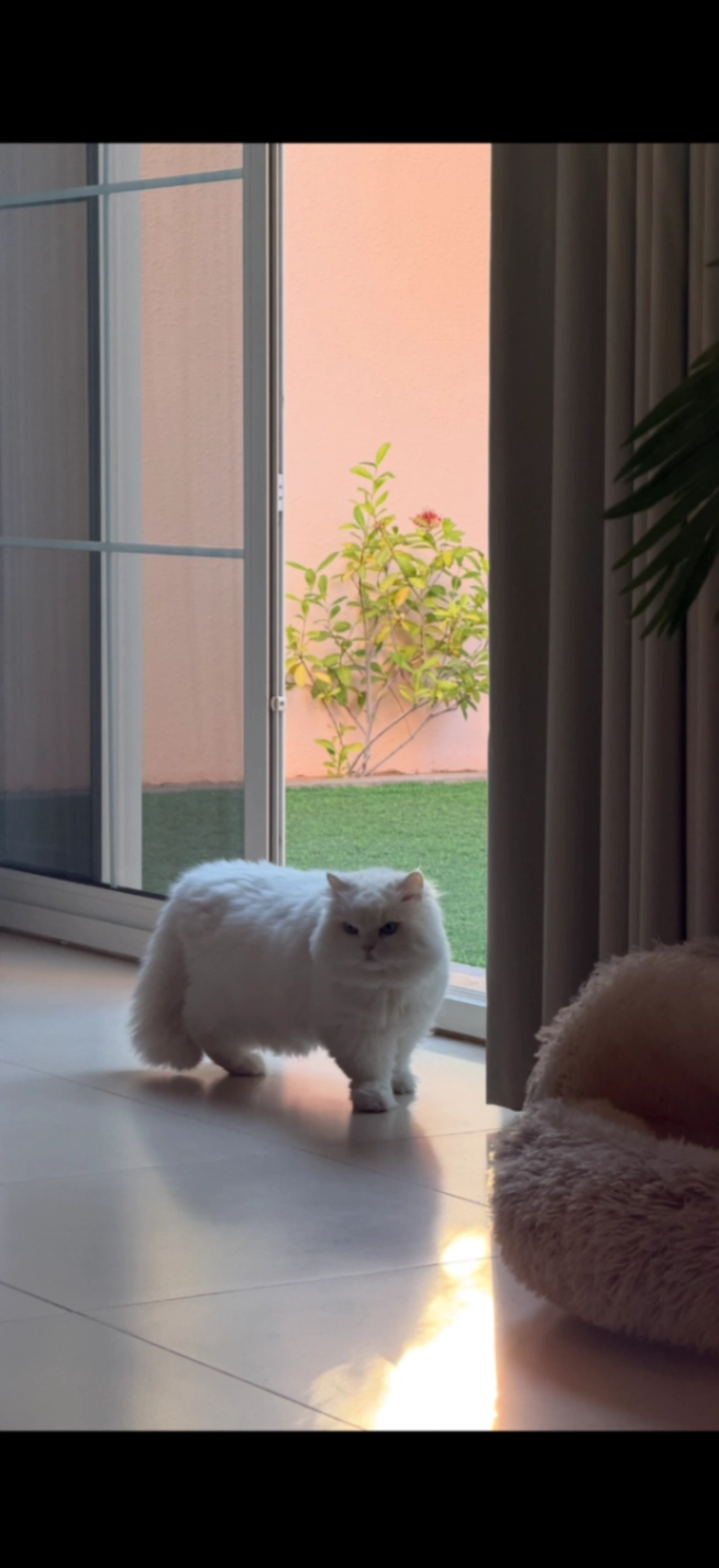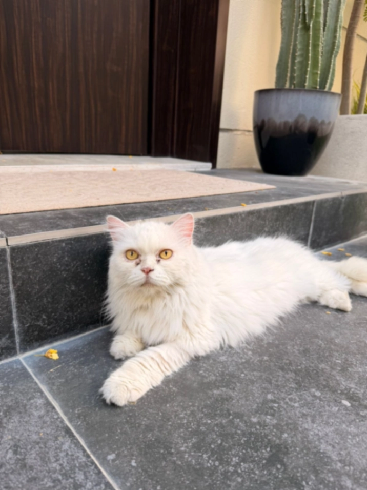 7 year old long hair white cat. First time ever being outside of the house so might be scared.