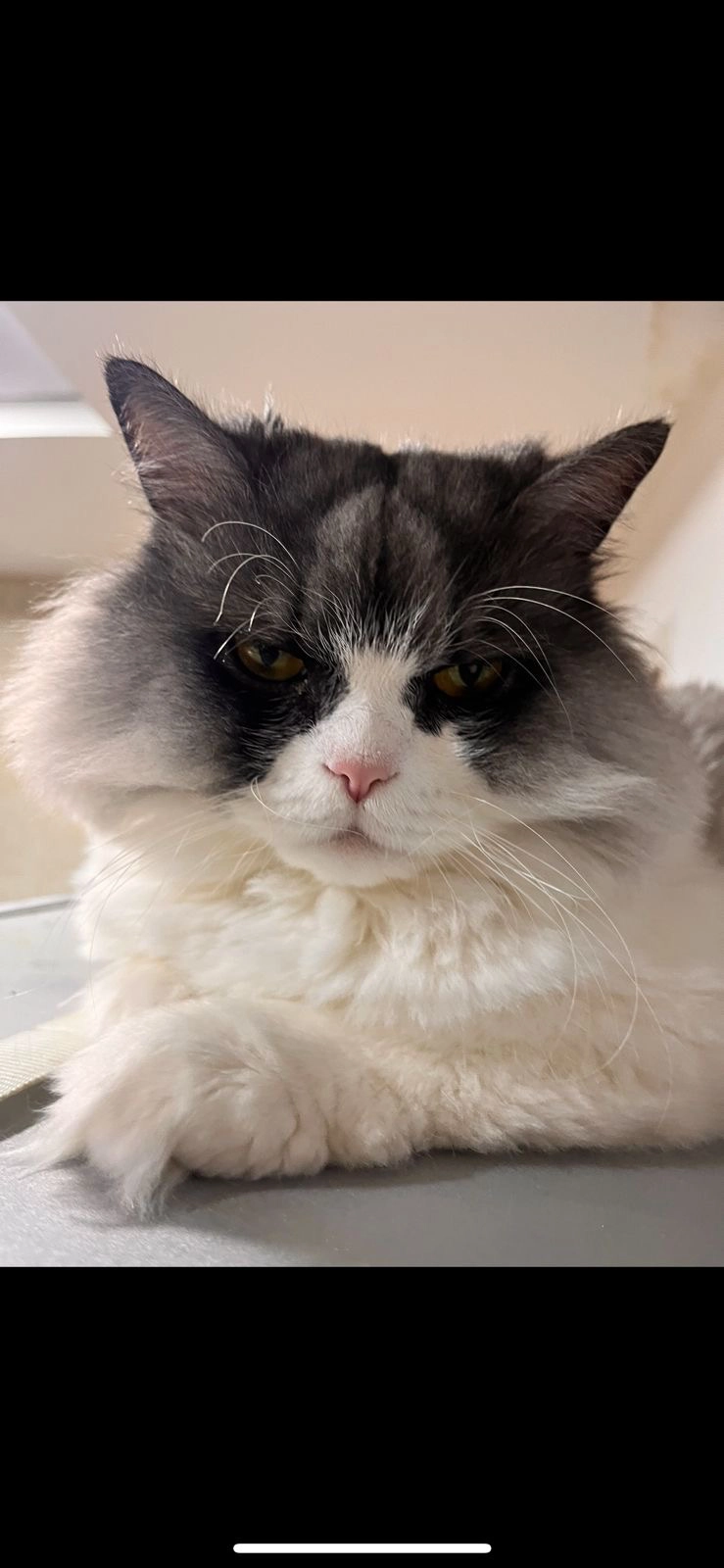 Grey and white fluffy cat, green/yellow eyes. We are desperately looking for him. He was last seen Sunday night, 8th February.