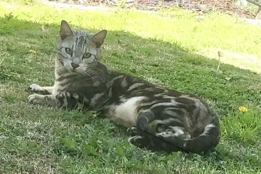 Silver Bengal, black coat with gold markings, shy and easily frightened, no collar
