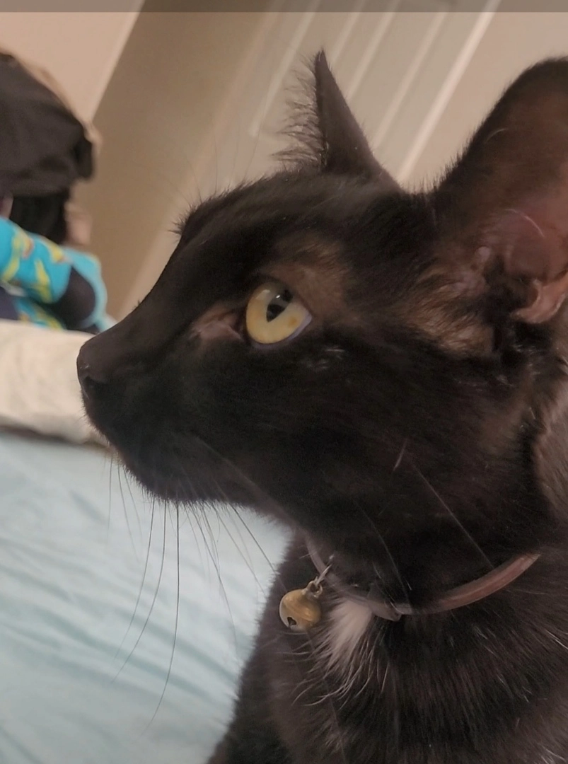 Black cat, small white patch on chest. Was wearing a blue collar.