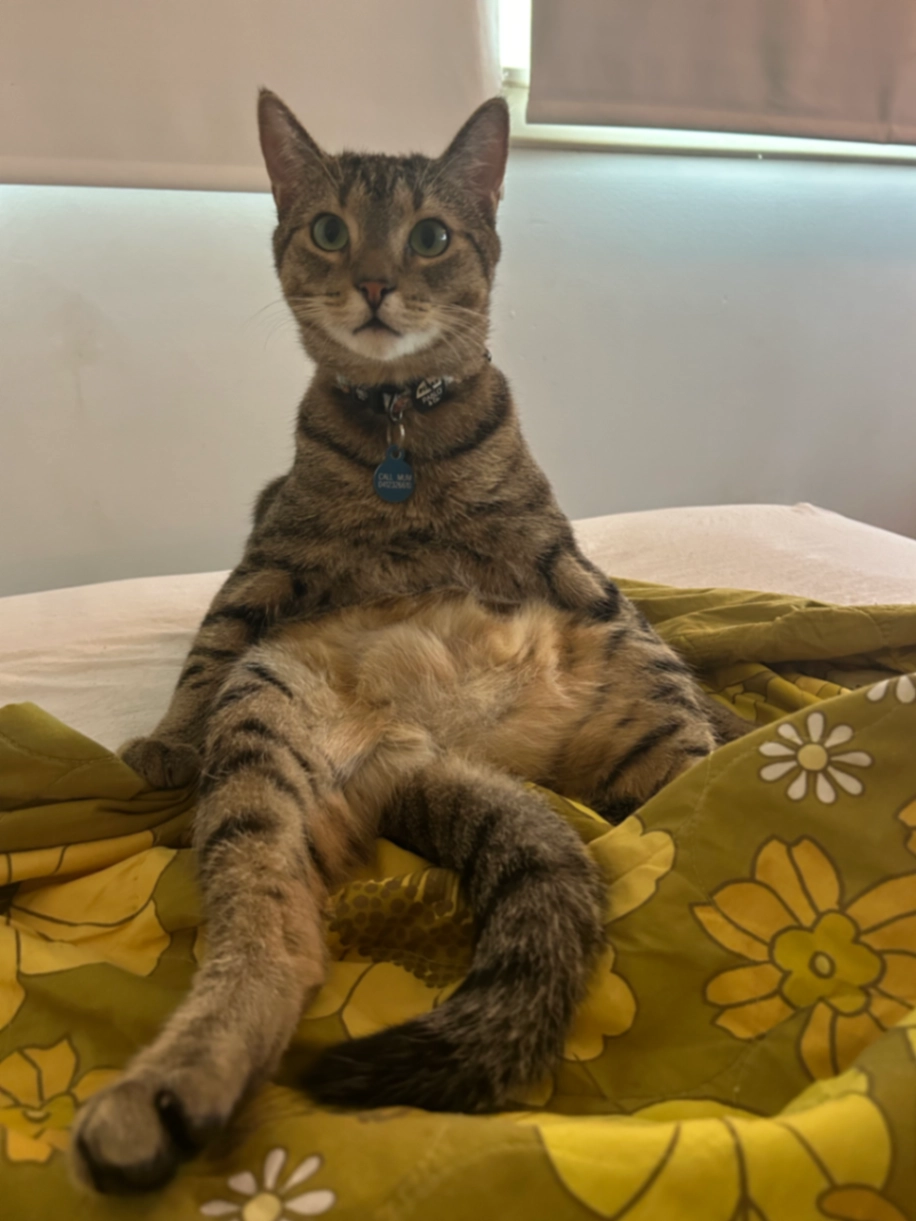 Mixed breed - brown and black colouring with black stripes. Wearing a light blue collar with a tile tracker and bell. Very affectionate and friendly, will come if call his name.