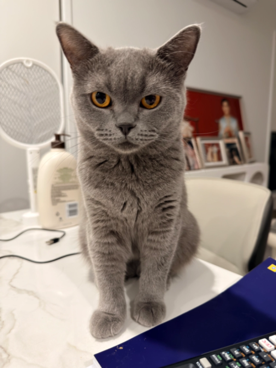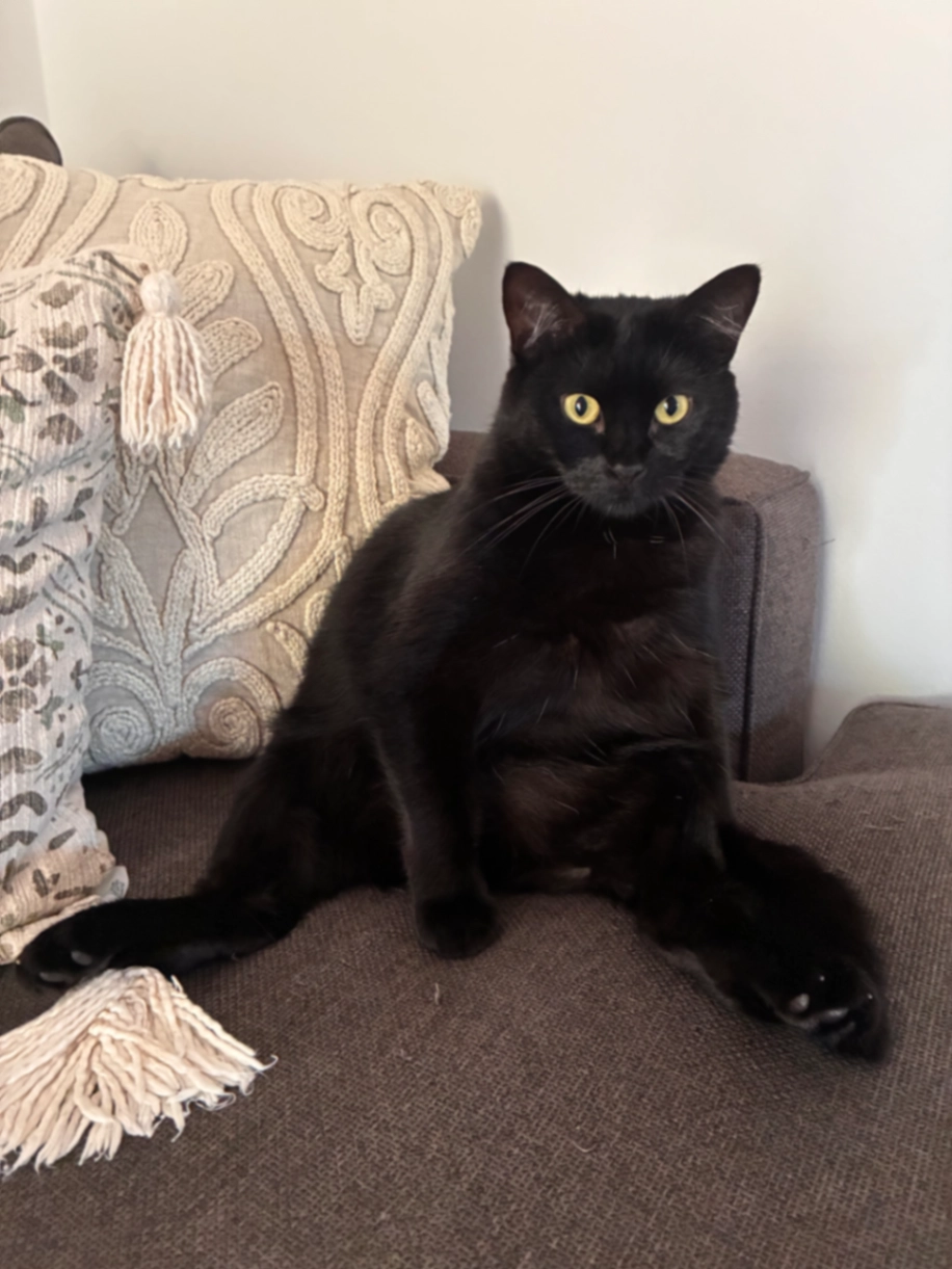 Pepsi is a fully black cat with short fur and big green eyes. She’s sort of fat and is a very friendly and sweet girl.