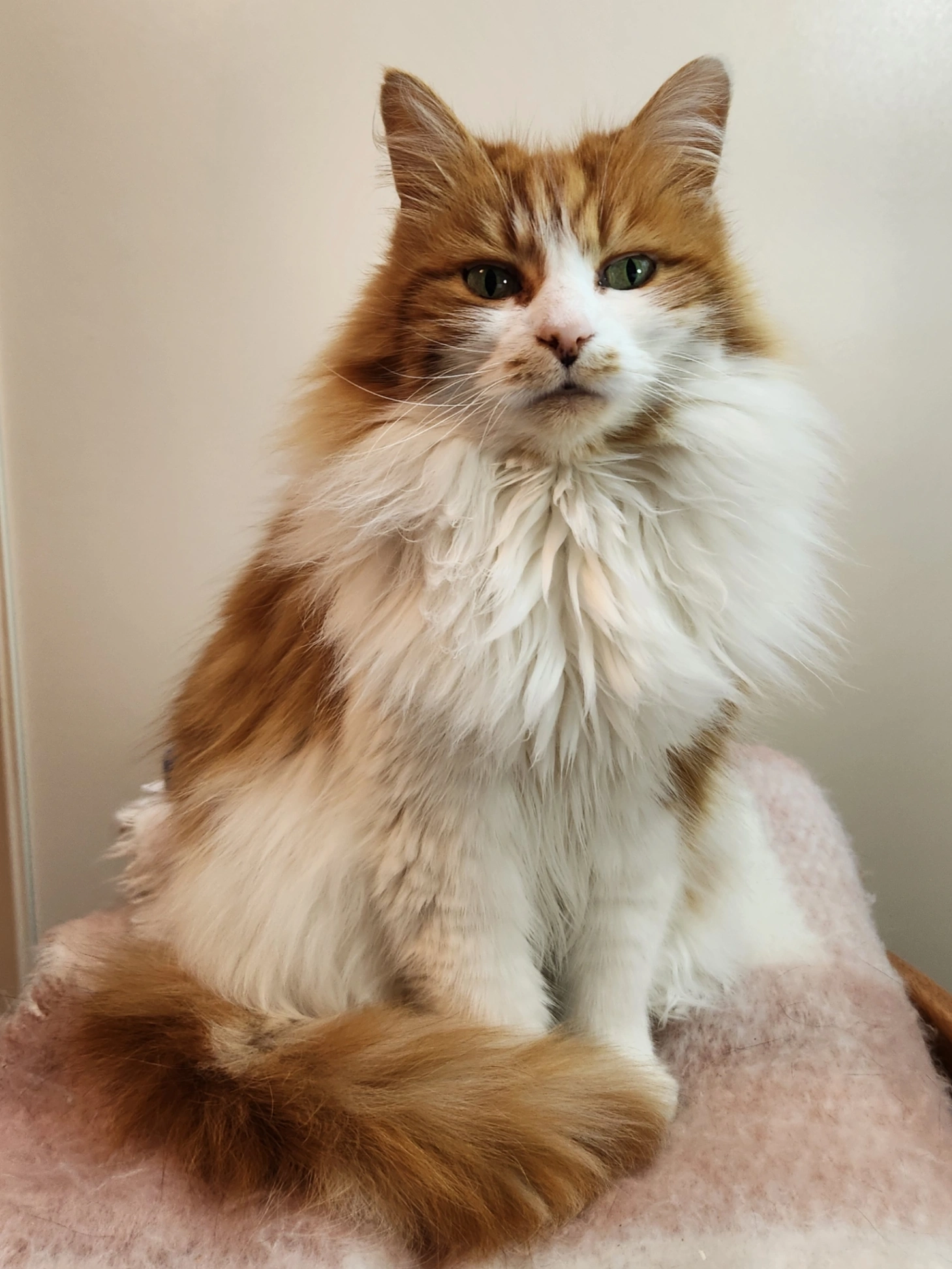 Fluffy white and ginger female, small build. Very skittish and anxious and likely hiding somewhere.