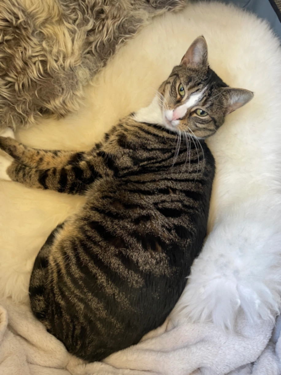 Medium size Tabby with a white nose. Very timid.