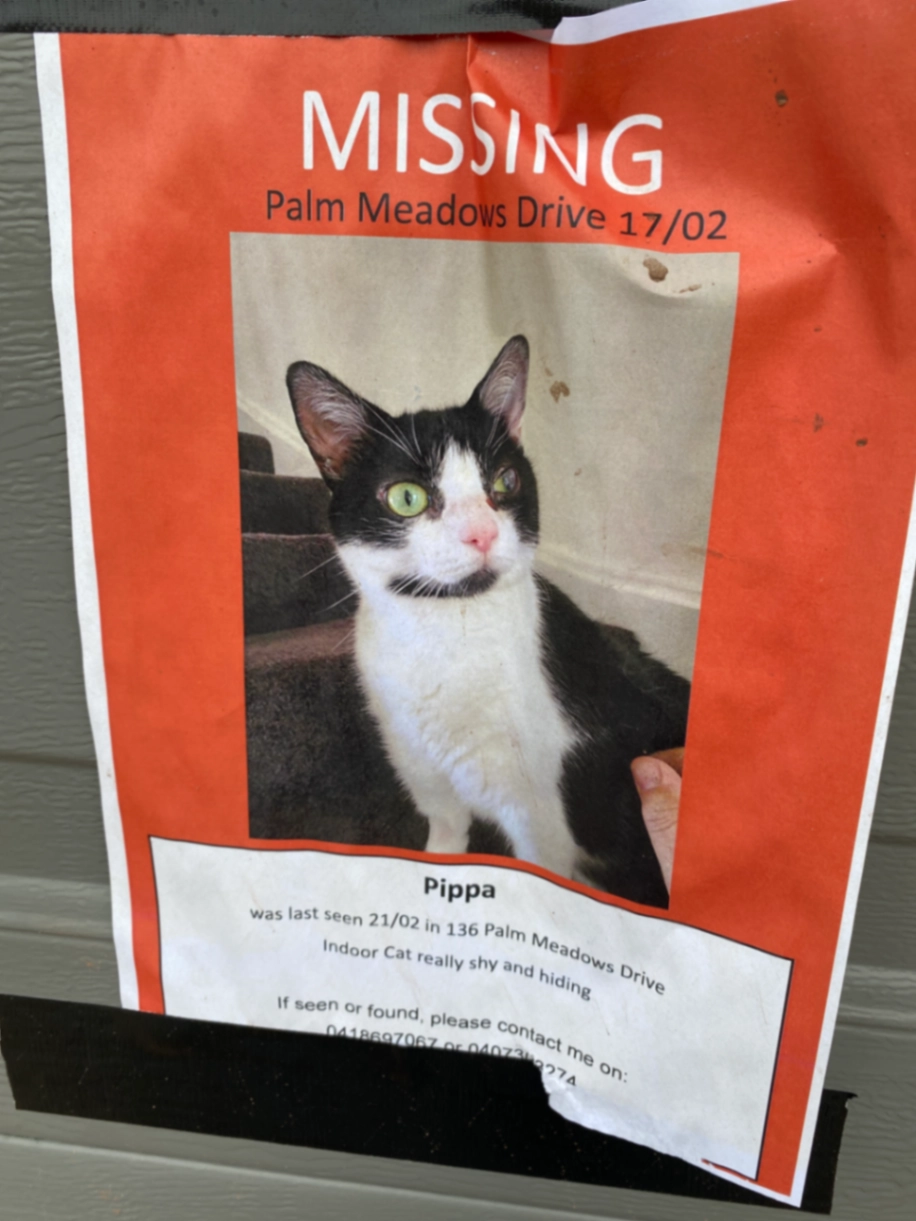 CleoReunited after2d, 10hHeartfelt thankyou to Pet Radar. The flyers were key to finding little Cleo. I door knocked and personally handed out flyers to all streets surrounding my area. It was through this that neighbours informed me of sightings so I narrowed down my late night walks calling out her name to particular areas. The more people are aware of cat missing the more chance of a safe return. Eternally grateful🙏💖