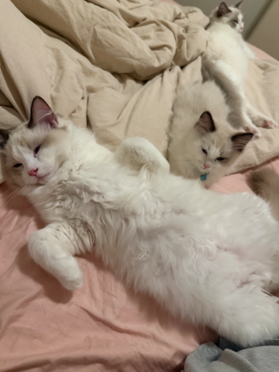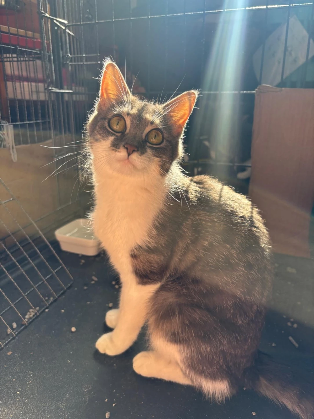 Our beautiful baby kitten, only 8 months old. Desexed and microchipped. Pretty wary of humans and was previously a stray who we only had home for about 1 month. Grey and white. White legs and chest. Grey on top