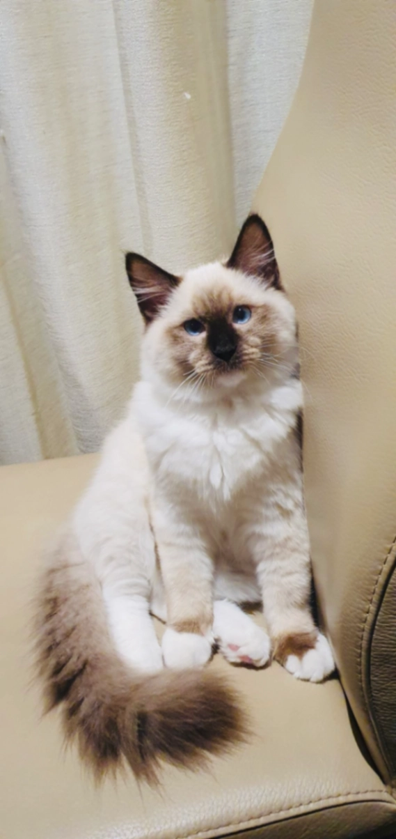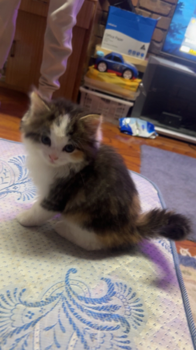 His a small kitten only 6 months old, he’s very shy and is afraid of new people so will most likely hide if he doesn’t know you, if you do locate him give him some wet whiskas kitten food