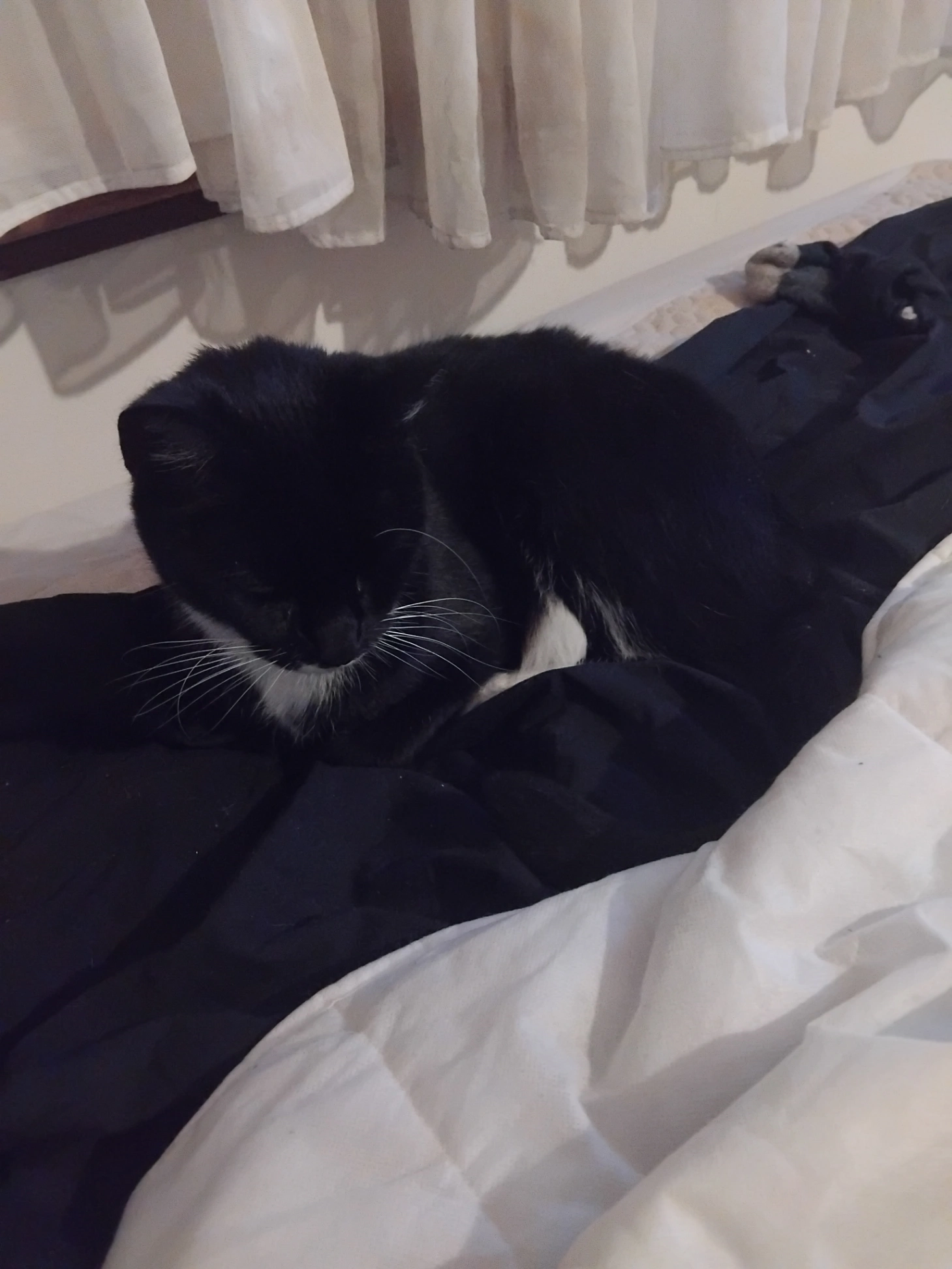 Maggie who is a boy is black and white tuxedo he's very friendly