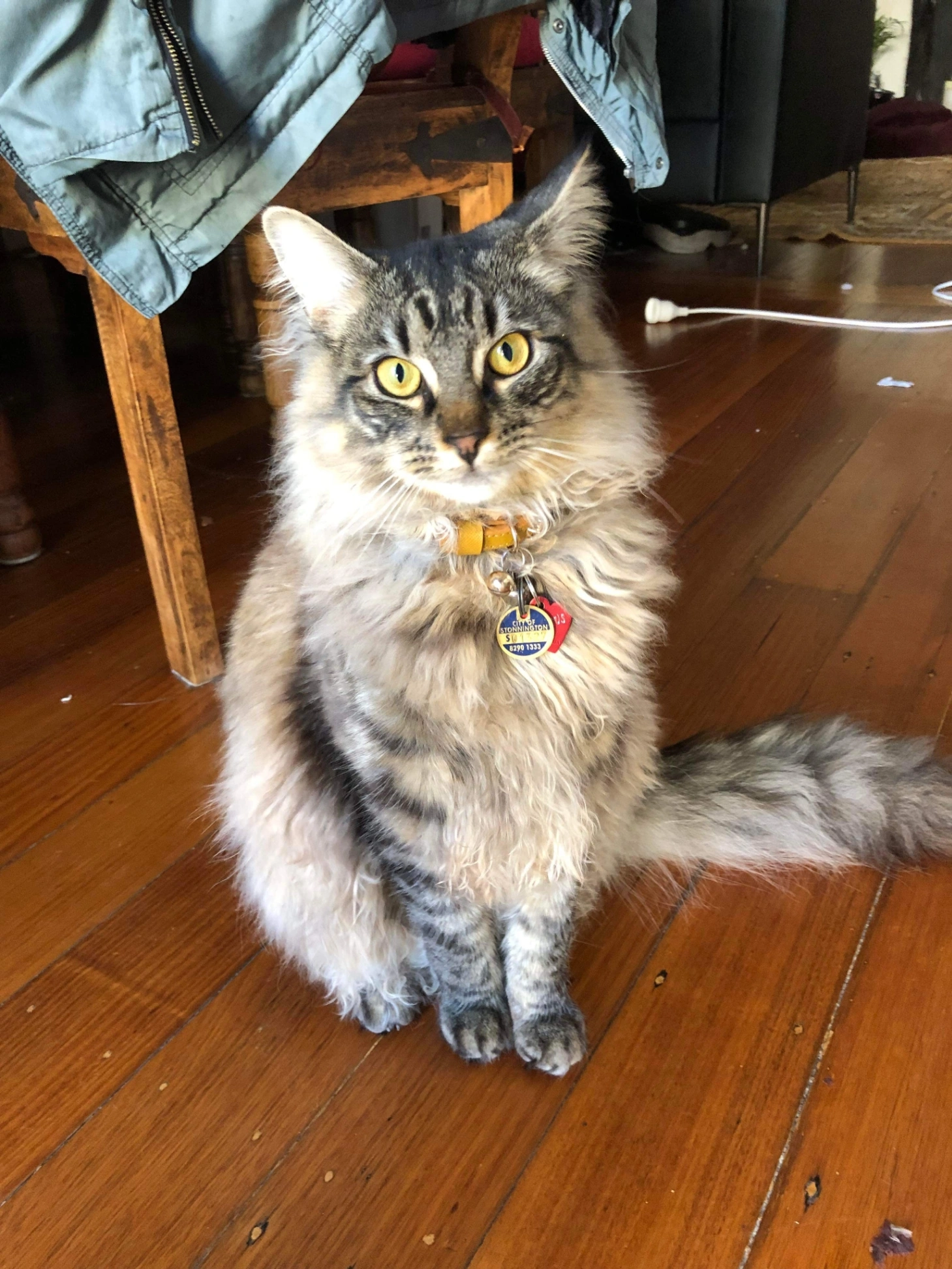 Grey Maine Coon male cat, with (medically necessary) lion cut hairstyle.