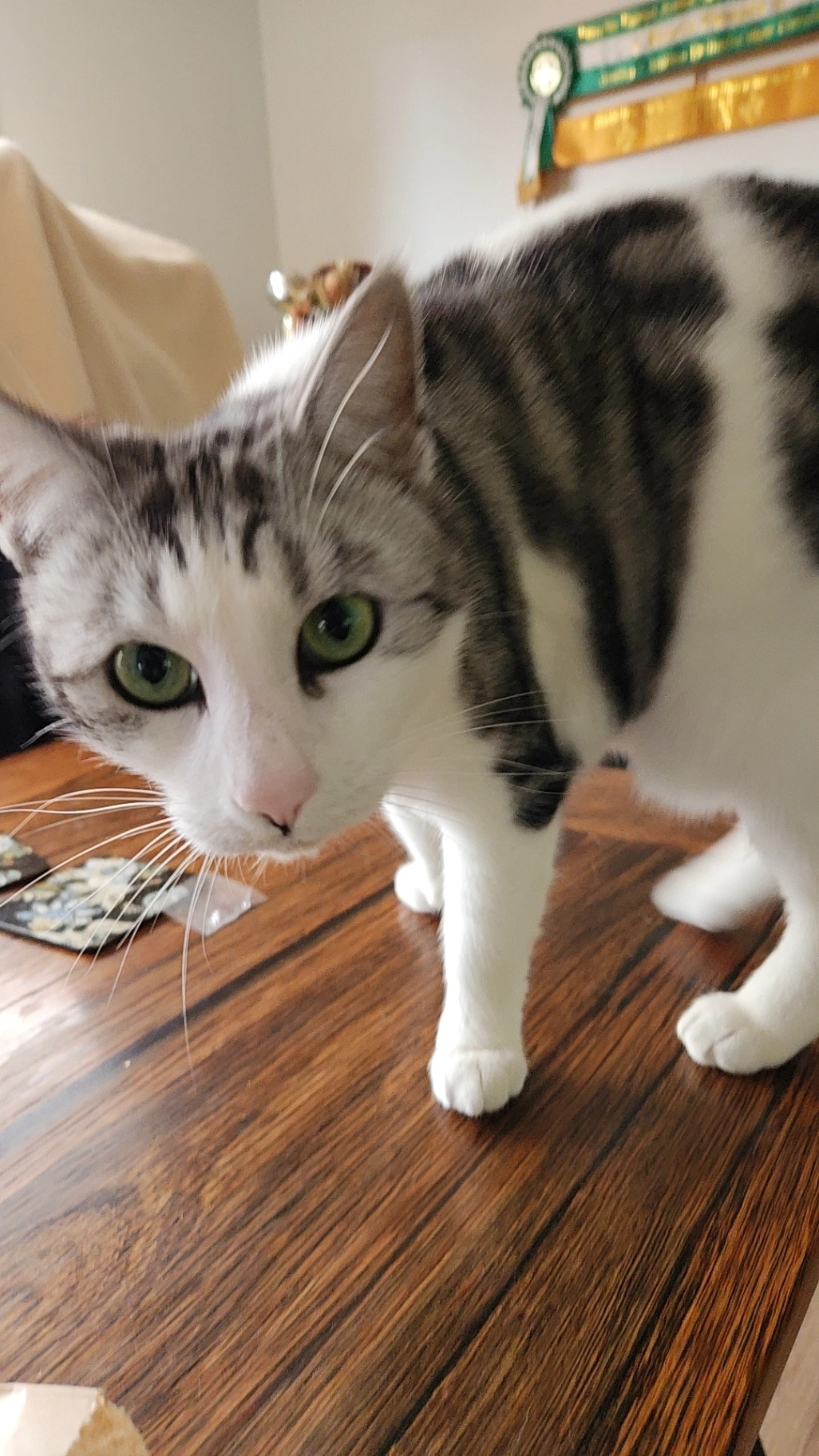 Large grey and white, medium hair cat. Very frightened, likes to hide and stay low.