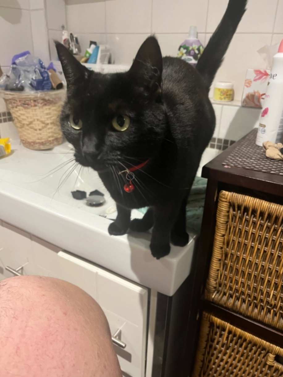 Solid black cat with green eyes, she is wearing a red collar that has a bandana with her name on it and her rego tag and crumb tag