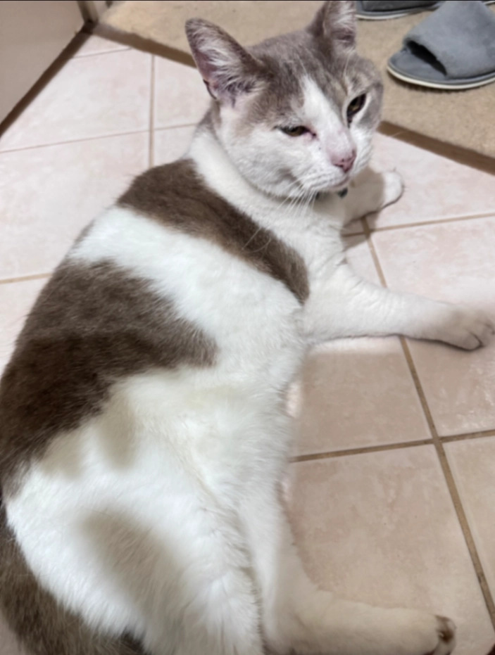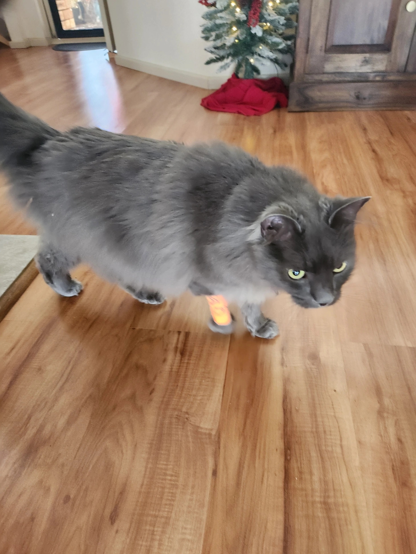 Marley is our 18 year old cat he has recently gone deaf so very easily startled still very playful at times when he’s not looking like a grumpy old kitty
