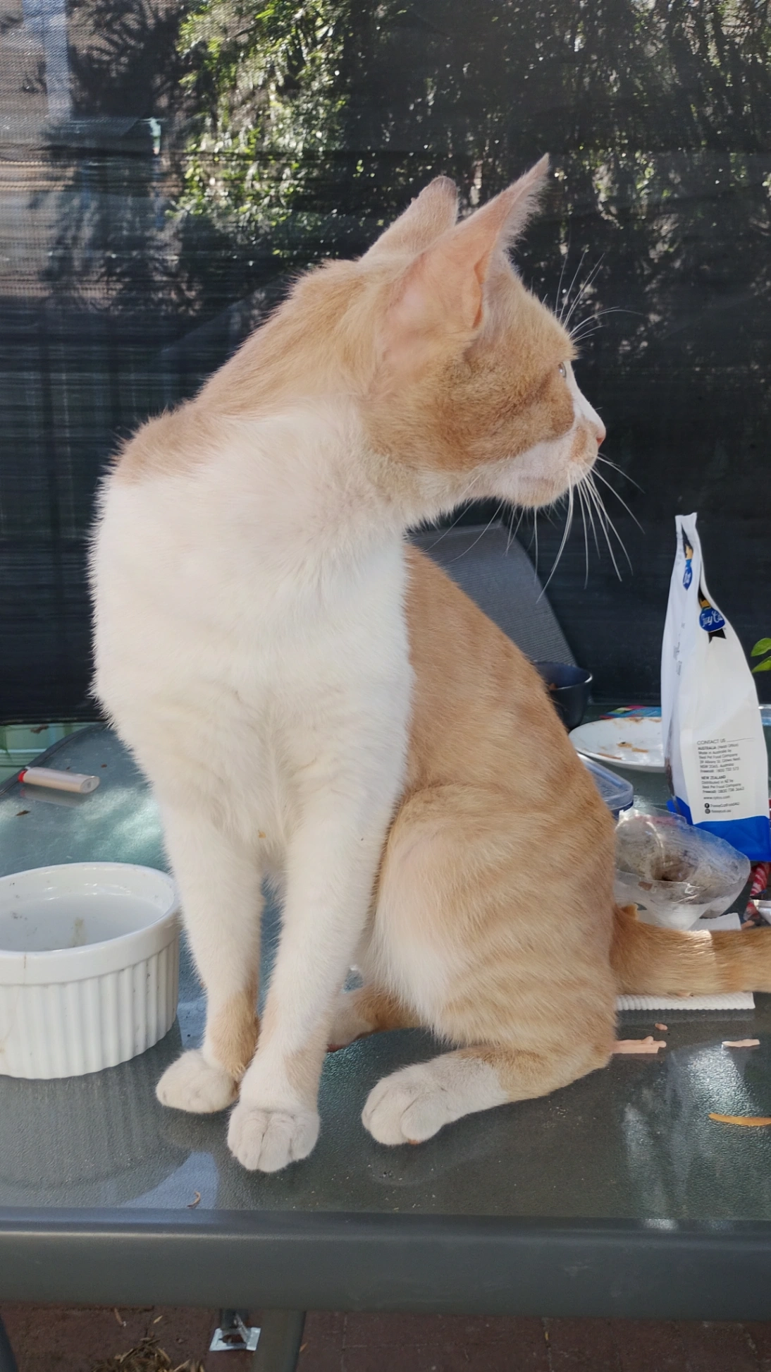 He is fairly lanky he's really skinny and quite small he's got lots of scars he's unnuted he's got a couple notches in his ears and he's an Orange y pink