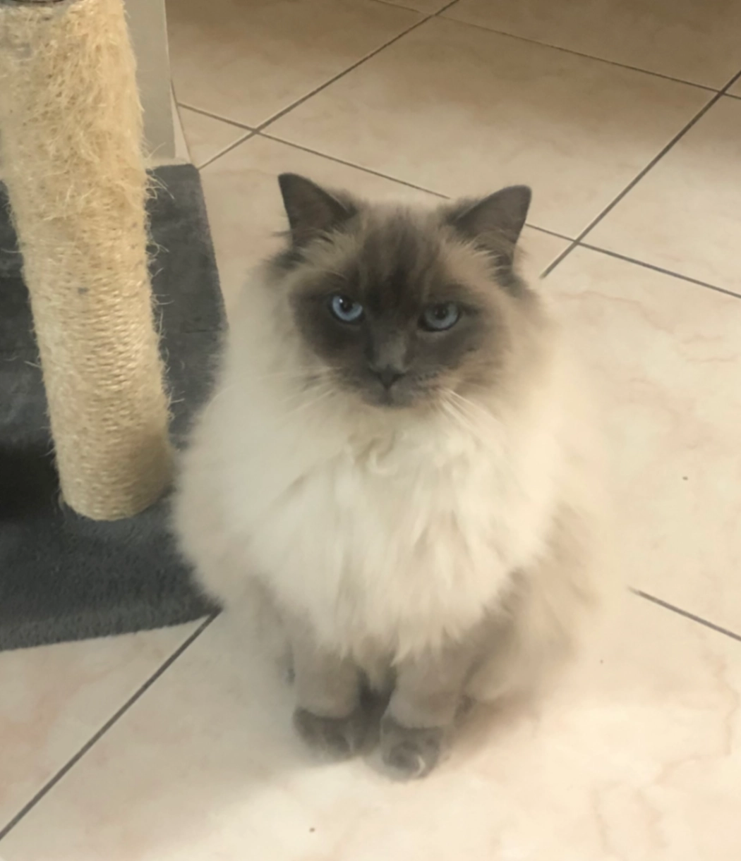 Purebred chocolate point ragdoll answers to Coco very timid is an indoor only cat