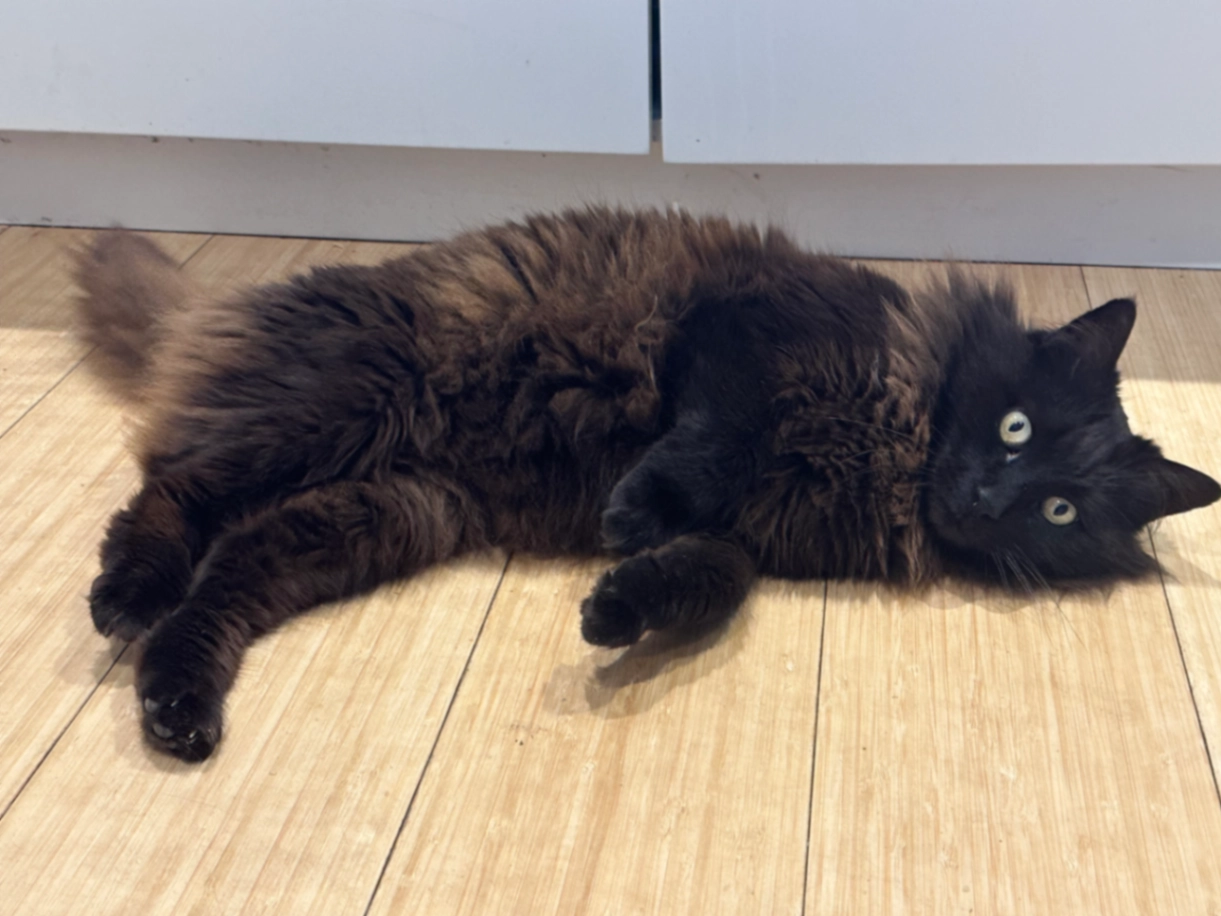 Max is a black cat but patches of his fur have turned brown with the sun and age. He is very fluffy. Recently had a bad haircut around the neck area. Yellow eyes and answers to his name.